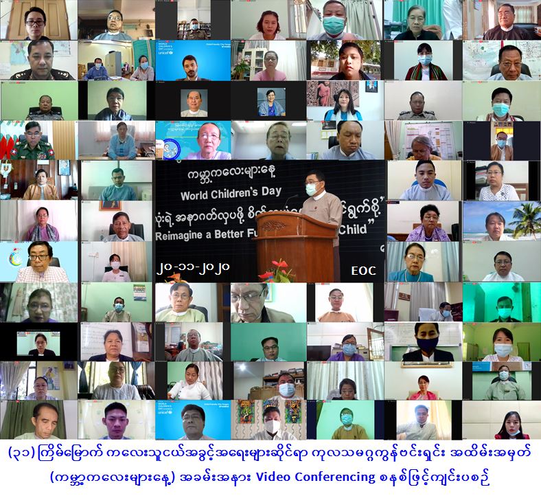 လက်ရှိရေးဆွဲလျက်ရှိသော ကလေးသူငယ်အခွင့်အရေးများဆိုင်ရာ နည်းဥပဒေနှင့် အမျိုးသားအဆင့် ကလေးသူငယ်ကာကွယ်စောင့် ရှောက်ရေးဆိုင်ရာ မူဝါဒတို့ကို ၂၀၂၀ ပြည့်နှစ်၊ ဒီဇင်ဘာလကုန်တွင် ပြဌာန်းနိုင်မည်ဖြစ်ကြောင်း၊ ကလေးသူငယ်အခွင့်အရေးများဆိုင်ရာ အမျိုးသား ကော်မတီကို ၂၀၂၀ပြည့်နှစ်၊ ဖေဖော်ဝါရီလတွင် ပြန်လည်ဖွဲ့စည်းခဲ့ပြီး တိုင်းဒေသကြီး/ ပြည်နယ်၊ ခရိုင်နှင့် မြို့နယ်ကလေးသူငယ်အခွင့်အရေးများဆိုင်ရာ ကော်မတီအဆင့်ဆင့်ကိုဖွဲ့စည်းကာ ကလေးသူငယ်များကို စနစ်တကျ ပြုစုစောင့်ရှောက်ခြင်း၊ ကာကွယ်ခြင်း၊ ကလေးသူငယ် အခွင့်အရေးများ အပြည့်အ၀ရရှိစေခြင်းများကို အကောင်အထည်ဖော်နိုင်ရေး ရှေးရှုပြီး ဆောင်ရွက် လျက်ရှိကြောင်း၊ ကလေးသူငယ်ဆိုင်ရာကိစ္စရပ်များကို ထိရောက်စွာ ဖြေရှင်းဆောင်ရွက်နိုင်ရန် နိုင်ငံတစ်ဝန်းလုံးရှိ လူမှုရေးရာ ဖြစ်ရပ်စီမံခန့်ခွဲရေးလုပ်ငန်းများ ကြီးကြပ်ရေးအဖွဲ့ကိုလည်း ၂၀၂၀ ပြည့်နှစ်၊ အောက်တိုဘာလတွင် ဖွဲ့စည်းခဲ့ပါကြောင်း၊ မြန်မာနိုင်ငံအနေဖြင့် ကလေးသူငယ် အခွင့်အရေးများဆိုင်ရာ ကုလသမဂ္ဂကွန်ဗင်းရှင်းအဖွဲ့ဝင်နိုင်ငံဖြစ်သည့်အတွက် ကော်မတီသို့ (၅)နှစ်တစ်ကြိမ် အစီရင်ခံစာတင်သွင်းရန်တာဝန်ရှိရာ ၂၀၂၀ ပြည့်နှစ်၊ ဒီဇင်ဘာလကုန်တွင် တင်သွင်းနိုင်ရေး စီစဉ်ဆောင်ရွက်လျက်ရှိကြောင်း၊ ထို့ကြောင့် ၂၀၂၀ ပြည့်နှစ်သည် ကလေးသူငယ် များအတွက် အခွင့်အရေးများကို ဖော်ဆောင်ရာတွင် ဒီမိုကရေစီစံနှုန်းများကို မြှင့်တင်နိုင်သော ပြုပြင်ပြောင်းလဲမှုများကို ဆောင်ရွက်နိုင်ပြီး အခြေခံအုတ်မြစ်ကောင်းများကို ချမှတ်နိုင်သော နှစ်ဖြစ်ကြောင်း၊ ကမ္ဘာ့ကုလသမဂ္ဂအဖွဲ့ကြီးက ယခုနှစ် ကမ္ဘာ့ကလေးများနေ့အတွက် ချမှတ် ပေးထားသည့်ဆောင်ပုဒ်မှာ “A Day to reimagine a better future for every child” “ကလေးအားလုံးရဲ့ အနာဂတ်လှပဖို့ စိတ်ကူးပုံဖော်ဆောင်ရွက်စို့” ဖြစ်ကြောင်း၊ ယခုအချိန်ခါသည် Covid-19 ကပ်ရောဂါကျရောက်ဆဲကာလဖြစ်သည့်အတွက် ကလေးသူငယ်များ၏ အခွင့်အရေး များဖော်ဆောင်ပေးရာမှာ အခက်အခဲများ ကြုံတွေ့နေရသော်လည်း လတ်တလောဖြေရှင်း ဆောင်ရွက်ပေးခြင်းမပြုပါက ကလေးငယ်များ၏ ဘဝတစ်သက်တာလုံးအတွက် ထိခိုက်စေနိုင် မည်ဖြစ်သည့်အတွက် အနာဂတ်မျိုးဆက်သစ်များအတွက် အားလုံးဝိုင်းဝန်းပူးပေါင်း ဆောင်ရွက် ပေးကြရန် တိုက်တွန်းလှုံ့ဆော်ထားခြင်း ဖြစ်ကြောင်း၊