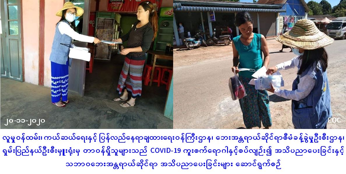 လူမှုဝန်ထမ်း၊ ကယ်ဆယ်ရေးနှင့် ပြန်လည်နေရာချထားရေးဝန်ကြီးဌာန၊ ဘေးအန္တရာယ်ဆိုင်ရာစီမံခန့်ခွဲမှုဦးစီးဌာန၊ ရှမ်းပြည်နယ်ဦးစီးမှူးရုံးမှ တာဝန်ရှိသူများသည် (၂၀-၁၁-၂၀၂၀) ရက်နေ့၊ ညနေပိုင်းတွင် ရွာငံမြို့နယ်၊ ဆင်ခေါင်းကျေးရွာနှင့် မြေနီကုန်းကျေးရွာတို့၌ COVID-19 ဒုတိယလှိုင်းကာလအတွင်း ပြည်သူများ လိုက်နာရမည့်ကျန်းမာရေးအမူအကျင့်များ အသိပညာပေးခြင်းနှင့် သဘာဝဘေးဆိုင်ရာ အသိပညာပေးခြင်းများကို Hand Speaker အသံချဲ့စက်များဖြင့် လှည့်လည်ဟောပြောခြင်း၊ Mask နှင့် အသိပညာပေးလက်ကမ်းစာစောင်များ ဖြန့်ဝေပေးခြင်းတို့အား ဆောင်ရွက်ခဲ့ကြောင်း သတင်းရရှိပါသည်။