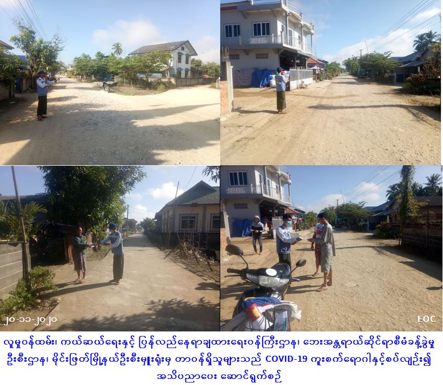 လူမှုဝန်ထမ်း၊ ကယ်ဆယ်ရေးနှင့် ပြန်လည်နေရာချထားရေးဝန်ကြီးဌာန၊ ဘေးအန္တရာယ်ဆိုင်ရာစီမံခန့်ခွဲမှုဦးစီးဌာန၊ မိုင်းဖြတ်မြို့နယ်ဦးစီးမှူးရုံးမှ တာဝန်ရှိသူများသည် (၂၀-၁၁-၂၀၂၀) ရက်နေ့၊ နံနက်ပိုင်းတွင် မိုင်းဖြတ်မြို့နယ်၊ ဝမ်နောင်ကျေးရွာနှင့် ပါပူးကျေးရွာတို့၌ Covid-19 ကူးစက်ရောဂါနှင့်စပ်လျဉ်း၍ အသိပညာပေးခြင်း၊ လက်ကမ်းစာစောင်၊ Mask နှင့် လက်ဆေးဆပ်ပြာများ ဖြန့်ဝေပေးခြင်းတို့ကို ဆောင်ရွက်ခဲ့ကြောင်း သတင်းရရှိပါသည်။