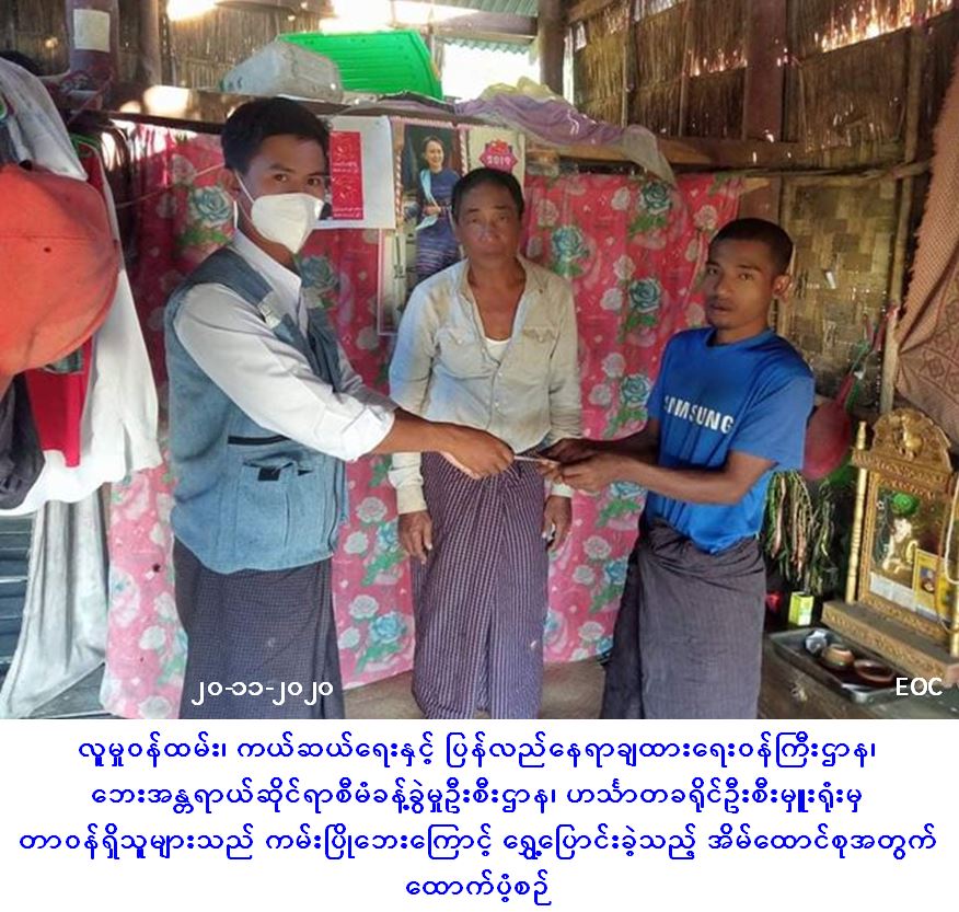 လူမှုဝန်ထမ်း၊ ကယ်ဆယ်ရေးနှင့် ပြန်လည်နေရာချထားရေးဝန်ကြီးဌာန၊ ဘေးအန္တရာယ်ဆိုင်ရာစီမံခန့်ခွဲမှုဦးစီးဌာန၊ ဟင်္သာတခရိုင်ဦးစီးမှူးရုံးမှ တာဝန်ရှိသူများသည် အင်္ဂပူမြို့နယ်၊ နောက်မီးကျေးရွာအုပ်စု၊ နောက်မီးအအရှေ့ဘက်ကမ်းကျေးရွာ၌ (၁၇-၁၁-၂၀၂၀) ရက်နေ့တွင် ကမ်းပြိုဘေးကြောင့် ရွှေ့ပြောင်းခဲ့သည့် အိမ်ခြေ(၁)လုံး၊ ၄င်းအိမ်ထောင်စု(၁)စုရှိ လူဦးရေ(၃)ဦးတို့အတွက် အိမ်ဆောက်ပစ္စည်းဖိုး(၁၀၀၀၀၀)ကျပ်၊ ဆန်ရိက္ခာဖိုး(၆၃၀၀)ကျပ်၊ စုစုပေါင်းထောက်ပံ့ရန်ပုံငွေ(၁၀၆၃၀၀)ကျပ်ကို (၂၀-၁၁-၂၀၂၀)ရက်နေ့၊ (၁၄:၀၀)နာရီအချိန်တွင်တာ၀န်ရှိသူများနှင့်အတူ ဘေးသင့်ပြည်သူများ လက်ဝယ်အရောက် ထောက်ပံ့ပေးအပ်ခဲ့ကြောင်း သတင်းရရှိပါသည်။