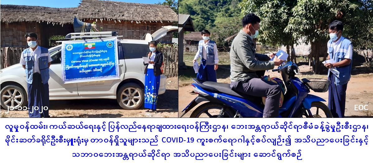 လူမှုဝန်ထမ်း၊ ကယ်ဆယ်ရေးနှင့် ပြန်လည်နေရာချထားရေးဝန်ကြီးဌာန၊ ဘေးအန္တရာယ်ဆိုင်ရာစီမံခန့်ခွဲမှုဦးစီးဌာန၊ မိုင်းဆတ်ခရိုင်ဦးစီးမှူးရုံးမှ တာဝန်ရှိသူများသည် (၂၁-၁၁-၂၀၂၀) ရက်နေ့တွင် မိုင်းဆတ်မြို့နယ်၊ တောင်လှေကားကျေးရွာနှင့် ချောင်းဆုံကျေးရွာတို့၌ Covid-19 ဒုတိယလှိုင်းကာလအတွင်း ပြည်သူများ လိုက်နာရမည့် ကျန်းမာရေးအမူအကျင့်များ အသိပညာပေးခြင်းနှင့် သဘာဝဘေးဆိုင်ရာ အသိပညာပေးခြင်းများကို Hand Speaker အသံချဲ့စက်များဖြင့် လှည့်လည်ဟောပြောခြင်း၊ Mask နှင့် အသိပညာပေးလက်ကမ်းစာစောင်များ ဖြန့်ဝေပေးခြင်းတို့အား ဆောင်ရွက်ခဲ့ကြောင်း သတင်းရရှိပါသည်။