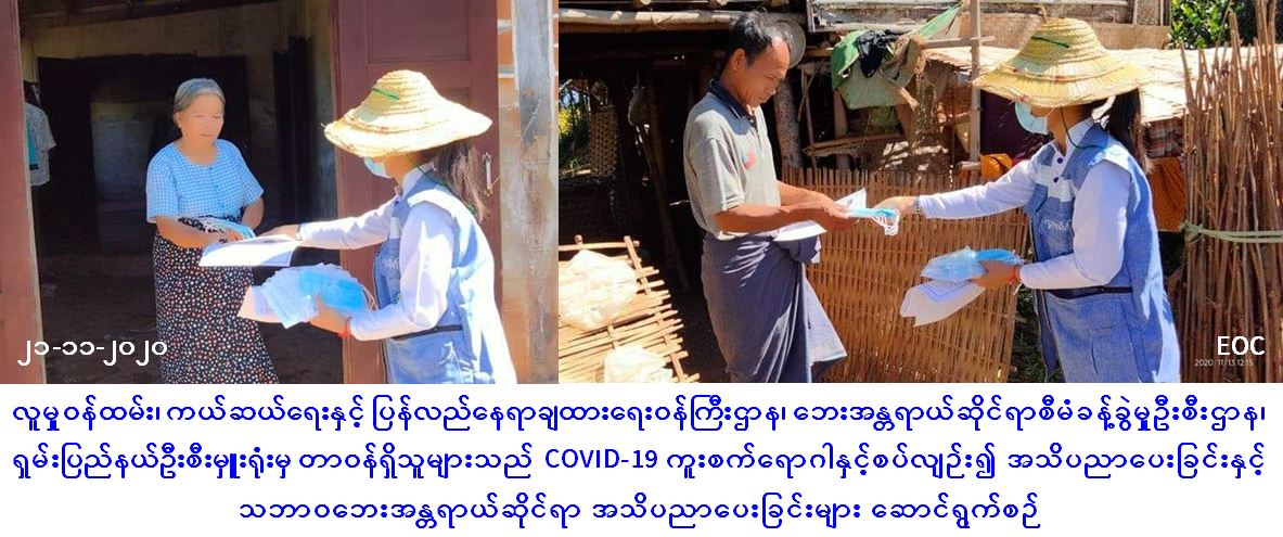 လူမှုဝန်ထမ်း၊ ကယ်ဆယ်ရေးနှင့် ပြန်လည်နေရာချထားရေးဝန်ကြီးဌာန၊ ဘေးအန္တရာယ်ဆိုင်ရာစီမံခန့်ခွဲမှုဦးစီးဌာန၊ ရှမ်းပြည်နယ်ဦးစီးမှူးရုံးမှ တာဝန်ရှိသူများသည် (၂၁-၁၁-၂၀၂၀) ရက်နေ့၊ နေ့လယ်ပိုင်းတွင် ရွာငံမြို့နယ်၊ နှင်းဖြူချောင်ကျေးရွာနှင့် မြိုင်ကျေးရွာတို့၌ COVID-19 ဒုတိယလှိုင်းကာလအတွင်း ပြည်သူများ လိုက်နာရမည့်ကျန်းမာရေးအမူအကျင့်များ အသိပညာပေးခြင်းနှင့် သဘာဝဘေးဆိုင်ရာ အသိပညာပေးခြင်းများကို Hand Speaker အသံချဲ့စက်များဖြင့် လှည့်လည်ဟောပြောခြင်း၊ Mask နှင့် အသိပညာပေးလက်ကမ်းစာစောင်များ ဖြန့်ဝေပေးခြင်းတို့ ဆောင်ရွက်ခဲ့ကြောင်း သတင်းရရှိပါသည်။