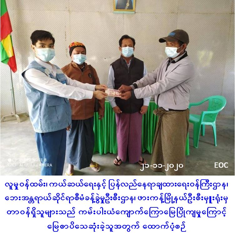 လူမှုဝန်ထမ်း၊ ကယ်ဆယ်ရေးနှင့် ပြန်လည်နေရာချထားရေးဝန်ကြီးဌာန၊ ဘေးအန္တရာယ်ဆိုင်ရာစီမံခန့်ခွဲမှုဦးစီးဌာန၊ ဖားကန့်မြို့နယ်ဦးစီးမှူးရုံးမှ တာဝန်ရှိသူများသည် ဖားကန့်မြို့နယ်၊ ဆိပ်မူကျေးရွာအုပ်စု၊ မမုံ၊ အထက်မက်လင်ချောင်ကျေးရွာဧရိယာရှိ YTT သက်တမ်းကုန်လုပ်ကွက်ကျင်းဟောင်းအောက်ခြေ၌ (၁၈-၁၁-၂၀၂၀) ရက်နေ့တွင် အမြင့်ပေ(၃၀)ခန့် ကမ်းပါးယံကျောက်ကြောမြေပြိုကျမှုကြောင့် မြေစာပိသေဆုံးခဲ့သူ (၁)ဦးအတွက် ထောက်ပံ့ငွေ(၃၀၀၀၀၀)ကျပ်အား (၂၁-၁၁-၂၀၂၀) ရက်နေ့၊ (၁၀:၄၀)နာရီအချိန်တွင် ဘေးသင့်ပြည်သူထံ လက်၀ယ်အရောက် သွားရောက်ထောက်ပံ့ပေးခဲ့ကြောင်း သတင်းရရှိပါသည်။