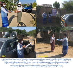 လူမှုဝန်ထမ်း၊ ကယ်ဆယ်ရေးနှင့် ပြန်လည်နေရာချထားရေးဝန်ကြီးဌာန၊ ဘေးအန္တရာယ်ဆိုင်ရာစီမံခန့်ခွဲမှုဦးစီးဌာန၊ မိတ္ထီလာခရိုင်ဦးစီးမှူးရုံးမှတာဝန်ရှိသူများသည် (၂၁-၁၁-၂၀၂၀)ရက်နေ့တွင် သာစည်မြို့နယ်အတွင်းရှိ ကုန်းတောင်းအုပ်စု(ကုန်းတောင်းတောင်/မြောက်/အနောက်)၊ ညောင်အိုင်အုပ်စု(ကမ္ဘားမြင့်၊ ညောင်အိုင်)၊ ဘုရားကုန်းအုပ်စု(ဘုရားကုန်း၊ ရွှေလှံတောင် /မြောက်) ကျေးရွာများသို့လည်းကောင်း၊ မိတ္ထီလာမြို့နယ်အတွင်းရှိ မြင်းကန်အုပ်စု(မြင်းကန်၊ ဆည်ကုန်း၊ မြိုင်ဃ၊ ဆင်စလွယ်၊ ဝက်ကုန်း၊ ထနောင်းကုန်း၊ အိုင့်၊ သနပ်အိုင့်)၊ သီးကုန်းအုပ်စု(သီးကုန်း၊ မကျီးချို၊ တုံ့အိုင်၊ ကျွဲဒတ်ပင်)နှင့် မုန်တိုင်အုပ်စု(ခံပင်အိုင့်၊ လဲတော၊ သရက်ခြံ၊ ဖလန်ကျင်း၊ ညောင်ပင်သာ၊ မုန်တိုင်)ကျေးရွာများရှိ ပြည်သူများအား Covid-19 ရောဂါ ကူးစက်ပြန့်ပွားမှုများမဖြစ်ပွားစေရေးအတွက် အသိပညာပေးနှိုးဆော်ခြင်းနှင့် သဘာဝဘေးအန္တရာယ်များနှင့်ပတ်သက်၍ ဆောင်ရန်/ ရှောင်ရန်အချက်အများအား အသိပညာပေးနှိုးဆော်ခဲ့ပါကြောင်း သတင်းရရှိပါသည်။