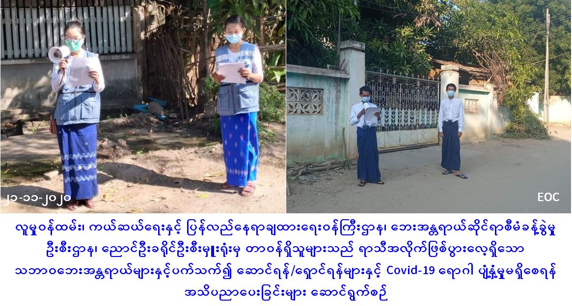 လူမှုဝန်ထမ်း၊ ကယ်ဆယ်ရေးနှင့် ပြန်လည်နေရာချထားရေးဝန်ကြီးဌာန၊ ဘေးအန္တရာယ်ဆိုင်ရာစီမံခန့်ခွဲမှုဦးစီးဌာန၊ ညောင်ဦးခရိုင်ဦးစီးမှူးရုံးမှ တာဝန်ရှိသူများသည် (၂၁-၁၁-၂၀၂၀) ရက်နေ့တွင် ညောင်ဦးခရိုင်အတွင်းရှိ ညောင်ဦးမြို့ပေါ်ရပ်ကွက်များနှင့် ကျောက်ပန်းတောင်းမြို့ပေါ်ရပ်ကွက်များအတွင်း ရာသီအလိုက်ဖြစ်ပွားလေ့ရှိသော သဘာဝဘေးအန္တရာယ်များနှင့်ပက်သက်၍ ဆောင်ရန်/ရှောင်ရန်များ၊ Covid-19 ရောဂါ ပျံ့နှံ့မှုမရှိစေရန် အသိပညာပေးပန်ကြားချက်များကို Loud Speaker၊ Hand Speaker တို့ဖြင့် လိုက်လံ အသိပေးနှိုးဆော်ခြင်းများ ဆောင်ရွက်ခဲ့ကြောင်း သတင်းရရှိပါသည်။