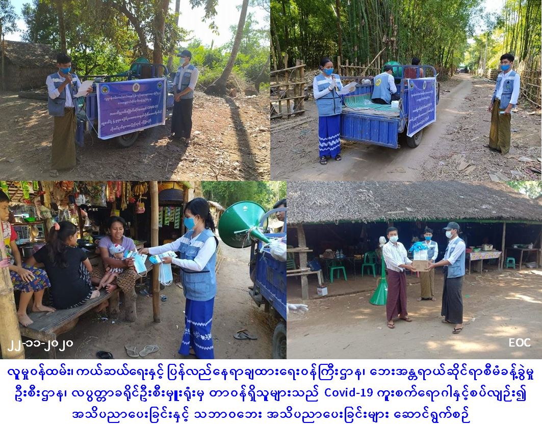 လူမှုဝန်ထမ်း၊ ကယ်ဆယ်ရေးနှင့် ပြန်လည်နေရာချထားရေးဝန်ကြီးဌာန၊ ဘေးအန္တရာယ်ဆိုင်ရာစီမံခန့်ခွဲမှုဦးစီးဌာန၊ လပွတ္တာခရိုင်ဦးစီးမှူးရုံးမှ တာဝန်ရှိသူများသည် AVSI FOUNDATION Myanmar နှင့်ပူးပေါင်း၍ (၂၂-၁၁-၂၀၂၀)ရက်နေ့၊ (၀၉:၀၀) နာရီအချိန်မှစတင်ကာ လပွတ္တာမြို့နယ်၊ ဘိုင်းဒေါင့်ချောင်းကျေးရွာအုပ်စု၊ ဘိုင်းဒေါင့်ချောင်းကျေးရွာ၊ ဘိုကုန်းကျေးရွာ၊ ကုန်းကြီးကျေးရွာ၊ ကဒန်းကြီးကျေးရွာနှင့် ချစ်တီးကုန်းကျေးရွာများအတွင်း Covid-19 အသက်ရှူလမ်းကြောင်းဆိုင်ရာရောဂါနှင့်ပတ်သက်၍ ကျန်းမာရေးနှင့်အားကစား၀န်ကြီးဌာနမှ ထုတ်ပြန်ထားသည့် ညွှန်ကြားချက်များနှင့် သဘာဝဘေးအန္တရာယ်ဆိုင်ရာအသိပညာပေးခြင်းများကို Loud Speaker ဖြင့် လှည့်လှည်၍ အသိပညာပေးခြင်း၊လက်ကမ်းစာစောင်များ၊ Masks များနှင့် ရေသန့်ဆေးထုပ်များအား ဝေငှခြင်းတို့ ပြုလုပ်ဆောင်ရွက်ခဲ့ကြောင်း သတင်းရရှိပါသည်။