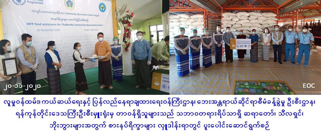 လူမှုဝန်ထမ်း၊ ကယ်ဆယ်ရေးနှင့် ပြန်လည်နေရာချထားရေးဝန်ကြီးဌာန၊ ဘေးအန္တရာယ်ဆိုင်ရာစီမံခန့်ခွဲမှုဦးစီးဌာန၊ ရန်ကုန်တိုင်းဒေသကြီးဦးစီးမှူးရုံးမှ တိုင်းဒေသကြီးဦးစီးမှူးနှင့်တာဝန်ရှိသူများသည် ရန်တိုင်းဒေသကြီးအစိုးရအဖွဲ့ ဝန်ကြီးချုပ် ဦးဖြိုးမင်းသိန်းနှင့်အစိုးရအဖွဲ့ဝင်များ၊ သန်လျင်မြို့နယ်အတွင်းရှိဌာနဆိုင်ရာများမှ တာဝန်ရှိသူများနှင့်အတူ (၂၀-၁၁-၂၀၂၀) ရက်နေ့၊ (၁၅:၀၀) နာရီအချိန်တွင် ကမ္ဘာ့စားနပ်ရိက္ခာအဖွဲ့ (WFP) က သန်လျင်မြို့၊ သဘာဝတရားရိပ်သာ သတိပဌာန်ဓမ္မာရုံကျောင်းတိုက်ရှိ သဘာဝတရားရိပ်သာမှ သံဃာတော်(၅၀၈)ပါး၊ သီလရှင်(၄၇၂)ပါး၊ သက်ကြီးယောဂီ(၁၀၉၃)ဦး၊ မသန်စွမ်း၊လေဖြတ်၊ဆွံ့အနားမကြား(၉၄၁) ဦး၊ တစ်ပါးဆောင်နှင့် ကိုယ်ပိုင်ဆောင်များမှ (၄၇၂) ဦး၊ ဝေယျာဝစ္စယောဂီနှင့်မှီခိုယောဂီ(၈၁၄)ဦးတို့အတွက် ဆန် ၅၀ ကီလိုပါအိတ်ဖြင့် (၁၁၆၁)အိတ် (၅၈.၀၅) တန်၊ ပဲ (၅၀) ကီလိုပါအိတ်ဖြင့် (၁၅၅) အိတ် (၇.၇၃၉) တန်၊ ဆီ (၁၈.၂) ကီလိုပါကာတွန်းဖြင့် (၂၁၅) ဖာ (၃.၉၁၃) တန်၊ ဆား (၄၅) ကီလိုပါအိတ်ဖြင့် (၁၅) အိတ် (ဝ.၆၄၅) တန်၊ ပစ္စည်း (၄) မျိုးစုစုပေါင်း (၇၀.၃၄၇) တန်၊ တန်ဖိုးငွေကျပ် (၄၄,၈၄၅,၅၀ဝိ/-) တိတိကို ဆက်ကပ်လှူဒါန်းခဲ့ရာ အဆိုပါဆက်ကပ်လှူဒါန်းပွဲသို့ တက်ရောက်ခဲ့ကြပြီး လှူဖွယ်ပစ္စည်းများကို ဦးစီးပဓာနနာယကဆရာတော်ထံ ဆက်ကပ်လှူဒါန်းပေးခဲ့ကြောင်း သတင်းရရှိပါသည်။