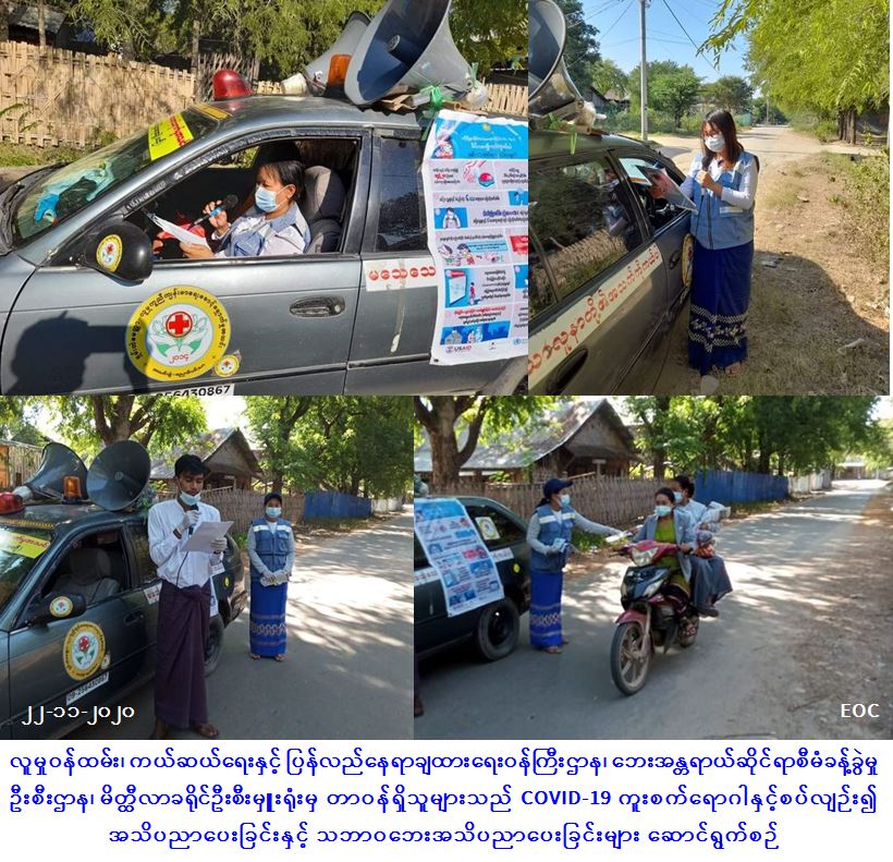 လူမှုဝန်ထမ်း၊ ကယ်ဆယ်ရေးနှင့် ပြန်လည်နေရာချထားရေးဝန်ကြီးဌာန၊ ဘေးအန္တရာယ်ဆိုင်ရာစီမံခန့်ခွဲမှုဦးစီးဌာန၊ မိတ္ထီလာခရိုင်ဦးစီးမှူးရုံးမှ တာဝန်ရှိသူများသည် (၂၂-၁၁-၂၀၂၀) ရက်နေ့တွင် သာစည်မြို့နယ်အတွင်းရှိ ရပ်ကွက်အမှတ် (၁)၊(၂)၊(၃)၊(၄)၊(၅)၊(၆)၊(၇)နှင့်ကပ်ကျေးအင်းအုပ်စု(ကပ်ကျေးအင်း၊ကန်စွယ်)ရွာကြီးအုပ်စု(ရွာကြီး)ကေျးရွာများသို့လည်းကောင်း၊ မိတ္ထီလာမြို့နယ်အတွင်းရှိ တပျော်အုပ်စု၊ သရက်ပင်အုပ်စု၊ ရေဝေအုပ်စုရှိ ကေျးရွာများနှင့်မြို့သစ်ကွက်သစ်ရှိ ရပ်ကွက်များနှင့် ပေါက်ချောင်းရပ်ကွက်သို့လည်းကောင်း Covid-19 ကူးစက်ရောဂါနှင့်ပတ်သက်၍ အသိပညာပေးခြင်းနှင့် ရာသီအလိုက်ဖြစ်ပွားလေ့ရှိသော သဘာဝဘေးအန္တရာယ်များနှင့်ပတ်သက်၍ ဆောင်ရန်/ ရှောင်ရန်များ အသိပညာပေးခြင်းတို့ကို ဆောင်ရွက်ခဲ့ကြောင်း သတင်းရရှိပါသည်။