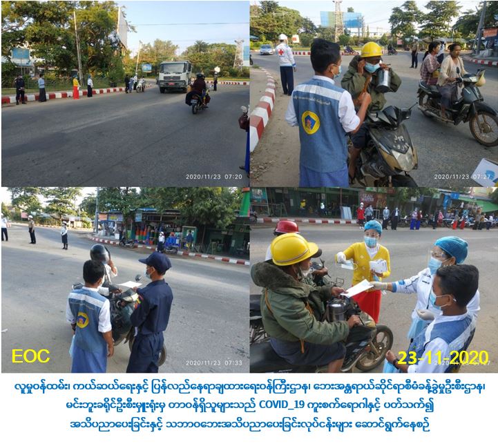 လူမှုဝန်ထမ်း၊ ကယ်ဆယ်ရေးနှင့် ပြန်လည်နေရာချထားရေးဝန်ကြီးဌာန၊ ဘေးအန္တရာယ် ဆိုင်ရာစီမံခန့်ခွဲမှုဦးစီးဌာန၊ မင်းဘူးခရိုင်ဦးစီးမှူးရုံးမှ တာဝန်ရှိသူများသည် (၂၃-၁၁-၂၀၂၀) ရက်နေ့၊ (၀၇:၀၀) နာရီအချိန်မှ (၀၈:၃၀) နာရီအချိန်ထိ မင်းဘူးမြို့၊ အဝိုင်းပတ်၌ အသက်ရှူလမ်းကြောင်းဆိုင်ရာရောဂါ Coronavirus Disease Covid-19 ကာကွယ်၊ လျော့ပါး ရေးအတွက် ဌာနဆိုင်ရာများနှင့်ပူးပေါင်း၍ Mask များနှင့် အသိပညာပေးလက်ကမ်းစာစောင် များအား ပြည်သူများသို့ ဝေငှပေးခြင်းလုပ်ငန်းများ ဆောင်ရွက်ခဲ့ကြောင်း သတင်းရရှိ ပါသည်။