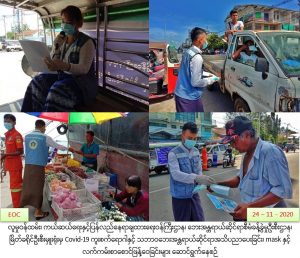 လူမှုဝန်ထမ်း၊ ကယ်ဆယ်ရေးနှင့်ပြန်လည်နေရာချထားရေးဝန်ကြီးဌာန၊ ဘေးအန္တရာယ်ဆိုင်ရာ စီမံခန့်ခွဲမှုဦးစီးဌာန၊ မြိတ်ခရိုင်ဦးစီးမှူးရုံးမှ တာဝန်ရှိသူများသည် (၂၄.၁၁.၂၀၂၀)နေ့တွင် မိသားစုညီညွှတ်ရေးပရဟိတအသင်းတိုနှင့်ပူးပေါင်း၍ မြိတ်မြို့နယ်၊ ဘုရားကိုင်ရပ်၊ စက်ဝင်းရပ်၊ အောင်မင်္ဂလာရပ်၊ ရာပြည့်ရပ်ကွက်တို့တွင်COVID-19 ကူးစက်ရောဂါ( ဒုတိယလှိုင်း) အသက်ရှူလမ်းကြောင်းဆိုင်ရာရောဂါ မဖြစ်ပွားစေရေးအတွက် အများပြည်သူသိရှိလိုက်နာနိုင်ရန် ကျန်းမာရေးနှင့် အားကစားဝန်ကြီးဌာနက ထုတ်ပြန်ထားသော အသိပေးကြေငြာချက်များနှင့် မိုးကြိုးဘေး၊ ရေဘေး၊ လေပြင်းဘေး ဆောင်ရန်ရှောင်ရန်များ အသိပညာပေးခြင်းအားဆောင်ရွက်ပြီး၊ လက်ကမ်းစာစောင်နှင့် Maskများ ဖြန့်ဝေခဲ့ကြောင်း သတင်းရရှိပါသည်။
