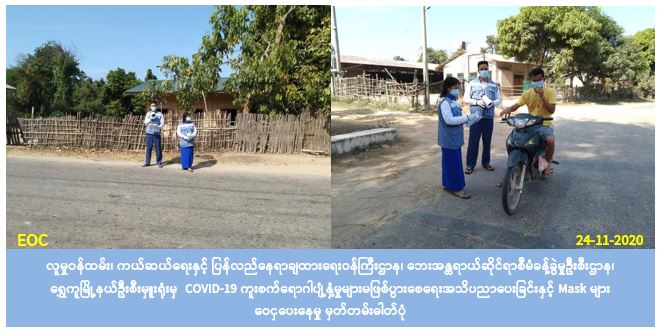 လူမှုဝန်ထမ်း၊ ကယ်ဆယ်ရေးနှင့် ပြန်လည်နေရာချထားရေးဝန်ကြီးဌာန၊ ဘေးအန္တရာယ်ဆိုင်ရာစီမံခန့်ခွဲမှုဦးစီးဌာန၊ ရွှေကူမြို့နယ်ဦးစီးမှူးရုံးမှ တာဝန်ရှိသူများသည် (၂၄-၁၁-၂၀၂၀) ရက်နေ့ နံနက် (၁၀း၃၀) နာရီအချိန်တွင် ရွှေကူမြို့နယ်၊ တိန်းဟွန်းကျေးရွာ၊ နုတ်ချိုကျေးရွာနှင့် မိုးလဲကျေးရွာများအတွင်းသို့ လှည့်လည်၍ အသက်ရူလမ်းကြောင်းဆိုင်ရာကူးစက်ရောဂါ COVID-19 ရောဂါနှင့်ပတ်သက်၍ ဆောင်ရန်/ရှောင်ရန်များ အသိပညာပေးချင်းနှင့် တစ်ခါသုံး Mask ဝေငှချင်းများကို ဆောင်ရွက်ခဲ့ကြောင်း သတင်းရရှိပါသည်။