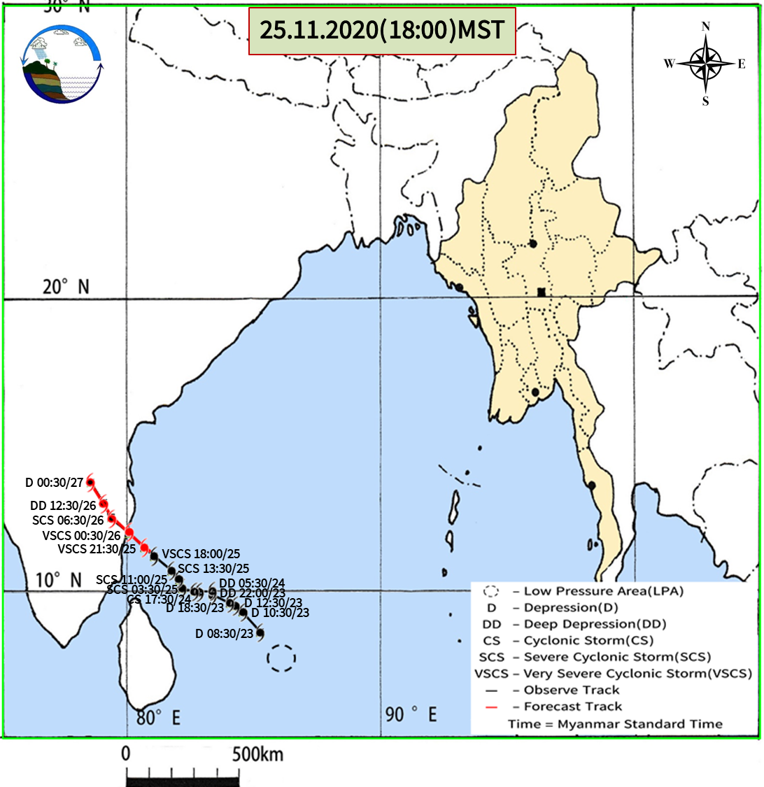 အဆိုပါ အားအလွန်ကောင်းသော ဆိုင်ကလုန်းမုန်တိုင်း (Very Severe Cyclonic Storm)”နီဗာ” (NIVAR)သည် အနောက်မြောက်ဘက်သို့ ရွေ့လျား ကာ ဆိုင်ကလုန်းမုန်တိုင်းအဖြစ် တစ်ဖြည်းဖြည်းအားလျော့သွားမည်ဟု ခန့်မှန်းရပါသည်။