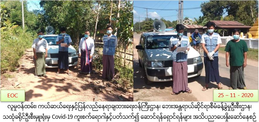 လူမှုဝန်ထမ်း၊ ကယ်ဆယ်ရေးနှင့်ပြန်လည်နေရာချထားရေးဝန်ကြီးဌာန၊ ဘေးအန္တရာယ်ဆိုင်ရာစီမံခန့်ခွဲမှုဦးစီးဌာန၊ သထုံခရိုင်ဦးစီးမှူးရုံးမှ တာဝန်ရှိသူများသည် (၂၅-၁၁-၂၀၂၀) ရက်နေ့၊(၁၀:၀၀)နာရီအချိန်မှ (၁၄:၀၀)နာရီအချိန် ထိ မွန်ပြည်နယ်၊ သထုံခရိုင်၊ သထုံမြို့နယ်၊ ဒူးရင်းဆိပ်ကျေးရွာအုပ်စု၊ ကြာပန်းကျေးရွာနှင့် ကဇိုင်းကျေးရွာတို့တွင် နေထိုင်သော ပြည်သူများအား Covid-19 ရောဂါကူးစက်ပျံ့နှံ့မှုများမဖြစ်ပွားစေရန်အတွက် လိုက်နာဆောင်ရွက်ရမည့် ဆောင်ရန်/ ရှောင်ရန်အချက်များကိုအသံချဲ့စက်ဖြင့် လှည့်လည်အသိပေးဟောပြောခြင်းအားဆောင်ရွက်ခဲ့ကြောင်း သတင်းရရှိပါသည်။