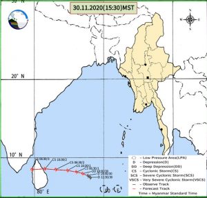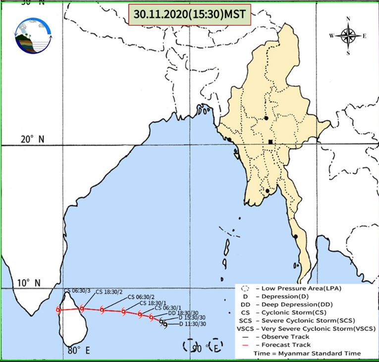 (၁) ယနေ့မြန်မာစံတော်ချိန်(၁၅:၃၀)နာရီအချိန် တိုင်းထွာချက်များအရ ဘင်္ဂလား ပင်လယ်အော်အရှေ့တောင်ပိုင်းတွင် ဖြစ်ပေါ်နေသော မုန်တိုင်းငယ် (Depression) သည် အနောက်-အနောက်မြောက်ဘက်သို့ ရွေ့လျားခဲ့ပြီး၊ သီရိလင်္ကာနိုင်ငံ၊ ထရီကိုမာလီ(Trincomalee)မြို့၏ အရှေ့-အရှေ့တောင်ဘက် ရေမိုင်(၃၉၀)မိုင် ခန့်နှင့် အိန္ဒိယနိုင်ငံ၊ ကန်ညာကူမာရီ(Kanyakumari)မြို့၏ အရှေ့-အရှေ့တောင်ဘက် ရေမိုင်(၆၀၅)မိုင်ခန့်အကွာ ပင်လယ်ပြင်ကို ဗဟိုပြုနေပါသည်။