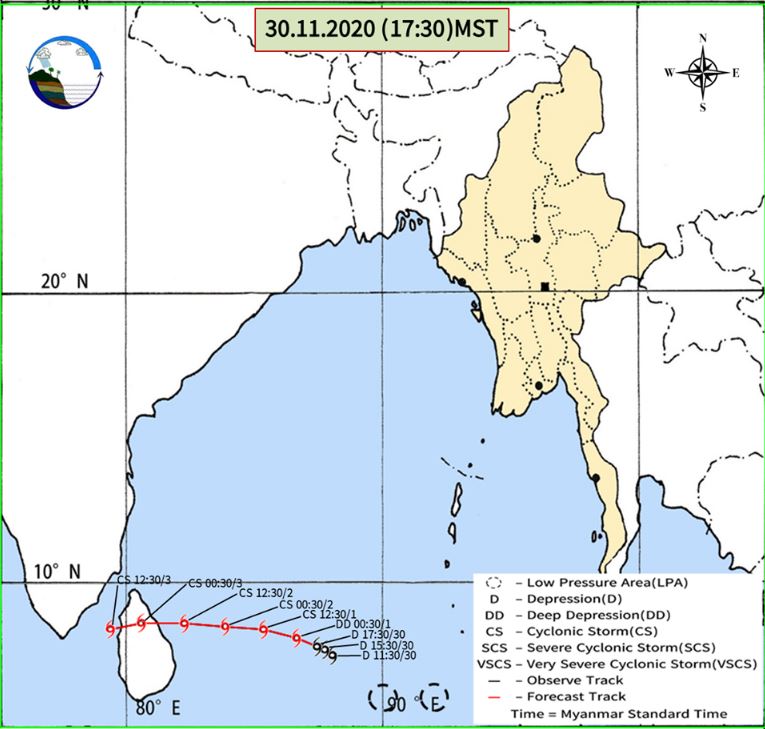 (၁) ယနေ့မြန်မာစံတော်ချိန်(၁၇:၃၀)နာရီအချိန် တိုင်းထွာချက်များအရ ဘင်္ဂလား ပင်လယ်အော်အရှေ့တောင်ပိုင်းတွင် ဖြစ်ပေါ်နေသော မုန်တိုင်းငယ် (Depression) သည် အနောက်-အနောက်မြောက်ဘက်သို့ ရွေ့လျားခဲ့ပြီး၊ သီရိလင်္ကာနိုင်ငံ၊ ထရီကိုမာလီ(Trincomalee)မြို့၏ အရှေ့-အရှေ့တောင်ဘက် ရေမိုင်(၃၇၀)မိုင်ခန့်နှင့် အိန္ဒိယနိုင်ငံ၊ ကန်ညာကူမာရီ(Kanyakumari)မြို့၏ အရှေ့ဘက် ရေမိုင် (၅၈၅)မိုင်ခန့်အကွာ ပင်လယ်ပြင်ကို ဗဟိုပြုနေပါသည်။