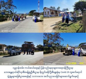 လူမှုဝန်ထမ်း၊ ကယ်ဆယ်ရေးနှင့် ပြန်လည်နေရာချထားရေးဝန်ကြီးဌာန၊ ဘေးအန္တရာယ်ဆိုင်ရာစီမံခန့်ခွဲမှုဦးစီးဌာန၊ မိုးညှင်းခရိုင်ဦးစီးမှူးရုံးမှ တာဝန်ရှိသူများသည် (၁-၁၂-၂၀၂၀) ရက်နေ့၌ မိုးညှင်းမြို့နယ်၊ နန့်မားမြို့ပေါ်၊ မြို့သစ်ကလေးကျေးရွာ နှင့် ညောင်ကုန်းကျေးရွာတို့တွင် COVID-19 ကူးစက်ရောဂါ ပျံ့နှံ့မှုများမဖြစ်ပွားစေရန် ပြည်သူများလိုက်နာရမည့် ကျန်းမာရေးအမူအကျင့်များ အသိပညာပေးခြင်းကို အသံချဲ့စက်ဖြင့် လှည့်လည်ဟောပြောခဲ့ပြီး Mask နှင့် သဘာဝဘေး အသိပညာပေးလက်ကမ်းစာစောင်များ ဖြန့်ဝေပေးခြင်းတို့ ဆောင်ရွက်ခဲ့ပါကြောင်း သတင်းရရှိပါသည်။