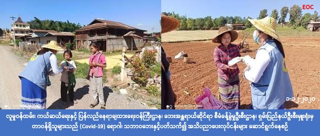 လူမှုဝန်ထမ်း၊ ကယ်ဆယ်ရေးနှင့်ပြန်လည်နေရာချထားရေးဝန်ကြီးဌာန၊ ဘေးအန္တရာယ်ဆိုင်ရာစီမံခန့်ခွဲမှု ဦးစီး ဌာန၊ ရှမ်းပြည်နယ်ဦးစီးမှူးရုံးမှ တာဝန်ရှိသူများသည် (၁-၁၂-၂၀၂၀)ရက်နေ့၊ နံနက်ပိုင်းတွင် တောင်ကြီးမြို့နယ်၊ ကျောက်တလုံးကြီးမြို့နယ်ခွဲ နောင်ကားဈေးနှင့် နောင်ပစ်ကျေးရွာတို့၌ လည်းကောင်း၊ နေ့လည်ပိုင်းတွင် တောင်ကြီးမြို့နယ်၊ ကျောက်တလုံးကြီးမြို့နယ်ခွဲ ပုံဆွေပင်ကျေးရွာနှင့် ဟမ်းဆီးကျေးရွာတို့၌လည်းကောင်း (COVID-19) ကာလအတွင်း ပြည်သူများ လိုက်နာရမည့်ကျန်းမာရေးအမူအကျင့်များ အသိပညာပေးခြင်းနှင့် သဘာဝဘေး ဆိုင်ရာ အသိပညာပေးခြင်းများကို Hand Speaker အသံချဲ့စက်များဖြင့် လှည့်လည်ဟောပြောခြင်း၊ Mask နှင့် အသိပညာပေးလက်ကမ်းစာစောင်များ ဖြန့်ပေးဝေခြင်းတို့ကို ဆောင်ရွက်ခဲ့ကြောင်း သိရှိရပါသည်။