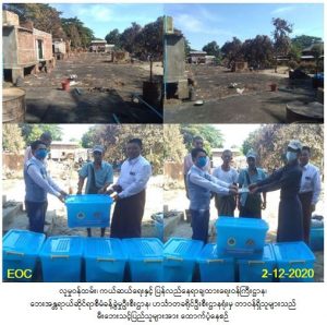 လူမှုဝန်ထမ်း၊ ကယ်ဆယ်ရေးနှင့် ပြန်လည်နေရာချထားရေးဝန်ကြီးဌာန၊ ဘေးအန္တရာယ် ဆိုင်ရာစီမံခန့်ခွဲမှုဦးစီးဌာန၊ ဟင်္သာတခရိုင်ဦးစီးမှူးရုံးမှ တာဝန်ရှိသူများသည် ဟင်္သာတခရိုင်၊ မြန်အောင်မြို့နယ်၊ သပြေကုန်းအုပ်စု၊ ရွာသစ်ကုန်းကျေးရွာတွင် (၂၇-၁၁-၂၀၂၀) ရက်နေ့တွင် ဖြစ်ပွားခဲ့သော မီးဘေးကြောင့် လောင်ကျွမ်းပျက်စီးဆုံးရှုံးခဲ့သည့် အိမ်ခြေ(၁)လုံး၊ လူဦးရေ (၃)ဦးနှင့် သပြေကုန်းအုပ်စု၊ ခုနစ်အိမ်တန်းကျေးရွာတွင် (၃၀-၁၁-၂၀၂၀) ရက်နေ့ဖြစ်ပွားခဲ့ သော မီးဘေးကြောင့် လောင်ကျွမ်းပျက်စီးဆုံးရှုံးခဲ့သည့် အိမ်ခြေ(၅)လုံး၊ လူဦးရေ(၁၃)ဦး၊ စုစုပေါင်းမီးဘေးသင့်အိမ်ခြေ(၆)လုံး၊ လူဦးရေ(၁၆)ဦးတို့အတွက် ကယ်ဆယ်ရေးပစ္စည်း(၁၆) မျိုးစီကို၊ အိမ်ထောင်စု(၆)စုစာအတွက် လည်းကောင်း၊ အိမ်ဆောက်ပစ္စည်းဖိုးရန်ပုံငွေကျပ် (၁,၁၀၀,၀၀ဝိ/-)ကိုလည်းကောင်း၊ ဆန်ရိက္ခာ(၇)ရက်စာရန်ပုံငွေကျပ်(၃၃,၆၀ဝိ/-)ကိုလည်း ကောင်း၊ စုစုပေါင်းကယ်ဆယ်ရေးရန်ပုံငွေကျပ် (၁,၁၃၃,၆၀ဝိ/-)တို့ကို (၂-၁၂- ၂၀၂၀)ရက်နေ့ (၁၂:၀၀) နာရီအချိန်တွင် ကျေးရွာအုပ်စုအုပ်ချုပ်ရေးမှူးနှင့်အတူ မီးဘေးသင့်ပြည်သူများ လက်ဝယ်သို့အရောက် ကွင်းဆင်း၍ ထောက်ပံ့ပေးအပ်ခဲ့ကြောင်း သတင်းရရှိပါသည်။