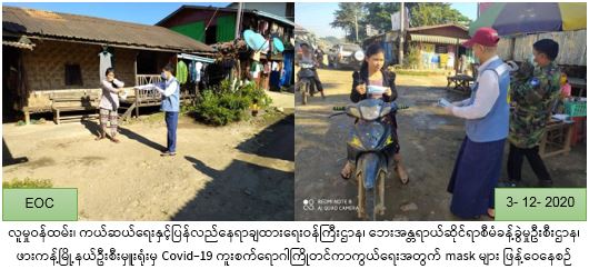 လူမှု၀န်ထမ်း၊ ကယ်ဆယ်ရေးနှင့်ပြန်လည်နေရာချထားရေး၀န်ကြီးဌာန၊ ဘေးအန္တရာယ်ဆိုင်ရာစီမံခန့်ခွဲမှုဦးစီးဌာန၊ ဖားကန့်မြို့နယ်ဦးစီးမှူးရုံးမှတာ၀န်ရှိသူများသည် (၂.၁၂.၂၀၂၀) ရက်နေ့၌ ဖားကန့်မြို့နယ်အတွင်းရှိ လုံးခင်းကျေးရွာ၊ မှော်စီစာကျေးရွာနှင့် နမ္မဖြစ်ကျေးရွာတို့တွင် COVID-19 ရောဂါကူးစက်မှုမဖြစ်ပွားစေရန် အများပြည်သူများ သိရှိလိုက်နာရမည့် ကျန်းမာရေးဆိုင်ရာ အသိပညာများအား အသံချဲ့စက်ဖြင့် လှည့်လည်ဟောပြောခြင်းနှင့် Mask များဖြန့်ဝေပေးခြင်းများဆောင်ရွက်ခဲ့ကြောင်း သတင်းရရှိပါသည်။