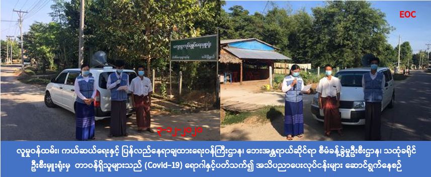 လူမှုဝန်ထမ်း၊ ကယ်ဆယ်ရေးနှင့် ပြန်လည်နေရာချထားရေးဝန်ကြီးဌာန၊ ဘေးအန္တရာယ်ဆိုင်ရာ စီမံခန့်ခွဲမှုဦးစီးဌာန၊ သထုံခရိုင်ဦးစီးမှူးရုံးမှ တာဝန်ရှိသူများသည် (၃-၁၂-၂၀၂၀) ရက်နေ့၊(၁၀:၀၀) နာရီအချိန်မှ(၁၄:၀၀)နာရီအချိန်ထိ မွန်ပြည်နယ်၊ သထုံခရိုင်၊ ပေါင်မြို့နယ်၊ သဲအိမ်ကျေးရွာနှင့် မဲဘောင်ကျေးရွာတို့တွင် နေထိုင်သောပြည်သူများအား Covid-19 ရောဂါကူးစက် ပျံ့နှံ့မှုများမဖြစ်ပွား စေရန်အတွက် လိုက်နာဆောင်ရွက်ရမည့် ဆောင်ရန်/ ရှောင်ရန်အချက်များကိုအသံချဲ့စက်ဖြင့် လှည့်လည်အသိပေးနှိုးဆော်ကြေညာခဲ့ခြင်းအားဆောင်ရွက်ခဲ့ပါကြောင်း သိရှိရပါသည်။