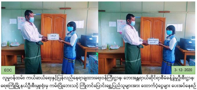 လူမှုဝန်ထမ်း၊ ကယ်ဆယ်ရေးနှင့်ပြန်လည်နေရာချထားရေးဝန်ကြီးဌာန၊ ဘေးအန္တရာယ်ဆိုင်ရာစီမံခန့်ခွဲမှုဦးစီးဌာန၊ ရေစကြိုမြို့နယ်ဦးစီးမှူးရုံးမှ တာဝန်ရှိသူများသည် ရေစကြိုမြို့နယ်၊ အောင်ပန်းချောင်းကျေးရွာအုပ်စု၊ အောင်ပန်းချောင်းကျေးရွာတွင်(၂-၁၂-၂၀၂၀)ရက်နေ့၊ (၁၀း၃၀)အချိန်၌ ချင်းတွင်းမြစ်ရေတိုက်စားကမ်းပါးပြိုကျမှုကြောင့် ကြိုတင်ဖျက်သိမ်းပြောင်းရွှေ့ခြင်းများ ဆောင်ရွက်ခဲ့ကြရာ ကြိုတင်ဖျက်သိမ်းပြောင်းရွှေ့လူနေအိမ်ခြေ(၅)လုံး၊ အိမ်ထောင်စု(၅)စု၊ လူဦးရေ(၁၇)ဦးတို့အတွက် အိမ်ဆောက်ပစ္စည်းဖိုး(၅၀၀၀၀ဝိ/-)၊ ဆန်ရိက္ခာဖိုး(၃၅၇၀ဝိ/-)၊ စုစုပေါင်းကျပ်(၅၃၅၇၀ဝိ/-)အား(၃-၁၂-၂၀၂၀)ရက်နေ့၊ (၁၅:၀၀)အချိန်တွင် ကျေးရွာအုပ်ချုပ်ရေးမှူးများထံသို့ လက်ဝယ်အရောက် ထောက်ပံ့ပေးအပ်ခဲ့ကြောင်း သတင်းရရှိပါသည်။