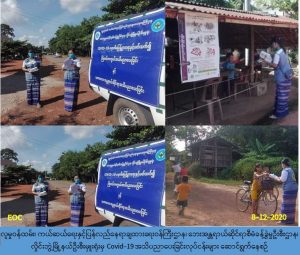 လူမှုဝန်ထမ်း၊ ကယ်ဆယ်ရေးနှင့်ပြန်လည်နေရာချထားရေးဝန်ကြီးဌာန၊ ဘေးအန္တရာယ်ဆိုင်ရာ စီမံခန့်ခွဲမှုဦးစီးဌာန၊ လှိုင်းဘွဲ့မြို့နယ်ဦးစီးမှူးရုံးမှ တာဝန်ရှိသူများသည် (၈-၁၂-၂၀၂၀) ရက်နေ့၊ နံနက် (၀၈:၀၀) နာရီအချိန်မှ နေ့လည် (၁၂:၀၀) နာရီအချိန်ထိ လှိုင်းဘွဲ့မြို့နယ်အတွင်း ဥဒေါင်း ကျေးရွာ၊ သိုက်တောကျေးရွာနှင့် ကျုံပကိုကျေးရွာတို့၌ Covid -19 ကူးစက်မြန်ရောဂါပြန့်ပွားမှု များ မဖြစ်ပွားစေရန်အတွက် သိရှိလိုက်နာရမည့် ဆောင်ရန်/ ရှောင်ရန်အချက်များအား အသံချဲ့ စက်ဖြင့် ပြည်သူလူထုအတွင်း အသိပညာပေးဆောင်ရွက်ခဲ့ပြီး လက်ကမ်းစာစောင်များနှင့် Mask များ ဖြန့်ဝေပေးခြင်းကိုလည်း ဆောင်ရွက်ခဲ့ပါကြောင်း သတင်းရရှိပါသည်။