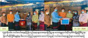 လူမှုဝန်ထမ်း၊ ကယ်ဆယ်ရေးနှင့်ပြန်လည်နေရာချထားရေးဝန်ကြီးဌာန၊ ဘေးအန္တရာယ်ဆိုင်ရာစီမံခန့်ခွဲမှုဦးစီးဌာန၊ မြဝတီခရိုင်ဦးစီးမှူးရုံးမှ ကရင်ပြည်နယ်၊ မြဝတီမြို့နယ်၊ အမှတ်(၄)ရပ်ကွက်၊ မေတ္တာ(၃)လမ်းတွင်(၇.၁၂.၂၀၂၀)ရက်နေ့ (၂၂း၀၀)နာရီချိန်၌ မီးအားမြှင့်စက်အပူလွန်ကဲရာမှတဆင့် မီးလောင်ကျွမ်းမှုကြောင့် လူနေအိမ်(၁)လုံး အိမ်ထောင်စု(၁)စုမှ လူဦးရေ(၃)ဦးတို့ မီးဘေးဒဏ်သင့်ခဲ့ပါသဖြင့် အိမ်ဆောက်ပစ္စည်းဖိုးထောက်ပံ့ငွေကျပ်(၂၀၀၀၀ဝိ/-)၊ ဆန်ရိက္ခာ(၇)စာဖိုးထောက်ပံ့ငွေကျပ်(၆၃၀ဝိ/-)၊ ဒဏ်ရာရရှိသူ (၂)ဦးအတွက် (၁၀၀၀၀ဝိ/-)၊ စုစုပေါင်းထောက်ပံ့ငွေကျပ်(၃၀၆၃၀ဝိ/-)အား မြဝတီမြို့ပြည်သူ့လွှတ်တော်ကိုယ်စားလှယ်၊ အထွေထွေအုပ်ချုပ်ရေးဦးစီးဌာန၊ ဒုမြို့နယ်အုပ်ချုပ်ရေးမှူး၊ မြဝတီမြို့ကြက်ခြေနီအသင်းတို့နှင့်အတူ (၈-၁၂-၂၀၂၀)ရက်နေ့ (၁၂း၃၀)နာရီအချိန်တွင် ဘေးသင့်ပြည်သူများထံသို့ ထောက်ပံ့ပေးခဲ့ကြောင်း သတင်းရရှိပါသည်။