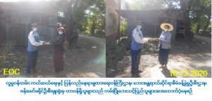 လူမှုဝန်ထမ်း၊ ကယ်ဆယ်ရေးနှင့် ပြန်လည်နေရာချထားရေးဝန်ကြီးဌာန၊ ဘေးအန္တရာယ် ဆိုင်ရာစီမံခန့်ခွဲမှုဦးစီးဌာန၊ ဗန်းမော်ခရိုင်ဦးစီးမှူးရုံးမှ တာဝန်ရှိသူများသည် (၈-၁၂-၂၀၂၀) ရက်နေ့တွင် ဖြစ်ပွားခဲ့သော ဗန်းမော်မြို့နယ်၊ လက်ပံတန်းကျေးရွာ၌ ဧရာ၀တီမြစ်ရေ တိုက်စားမှုကြောင့် ကမ်းပါးအနီးတွင်နေထိုင်သော လူနေအိမ်(၂)လုံး ဘေးလွှတ်ရာသို့ ကြိုတင်ဖျက်သိမ်း ပြောင်းရွှေ့ခဲ့ရာ ဘေးသင့်အိမ်ထောင်စု(၂)စု၊ လူဦးရေ(၁၅)ဦးတို့အတွက် တစ်ဦးလျှင်(၂,၁၀ဝိ/-) ကျပ်နှုန်းဖြင့် ဆန်ရိက္ခာ(၇)ရက်စာထောက်ပံ့ငွေ (၃၁,၅၀ဝိ/-) ကျပ်နှင့် အိမ်ဆောက်ပစ္စည်းဖိုးထောက်ပံ့ငွေ(၂၀၀,၀၀ဝိ/-) ကျပ်၊ စုစုပေါင်း (၂၃၁,၅၀ဝိ/-) ကျပ်အား (၁၀-၁၂-၂၀၂၀) ရက်နေ့၊ နံနက် (၁၁:၀၀) နာရီအချိန်၌ ဘေးသင့်ပြည်သူများထံသို့ လက်ဝယ် အရောက် သွားရောက်ထောက်ပံ့ခဲ့ကြောင်း သတင်းရရှိပါသည်။