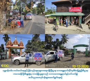 လူမှုဝန်ထမ်း၊ ကယ်ဆယ်ရေးနှင့် ပြန်လည်နေရာချထားရေးဝန်ကြီးဌာန၊ ဘေးအန္တရာယ် ဆိုင်ရာစီမံခန့်ခွဲမှုဦးစီးဌာန၊ ကလေးခရိုင်ဦးစီးမှူးရုံးမှ တာဝန်ရှိသူများသည် (၁၀-၁၂-၂၀၂၀) ရက်နေ့၊ နံနက်(၈:၀၀) အချိန်မှ (၁၆:၀၀)နာရီအချိန်အထိ ကလေးမြို့၊ မြို့သာရပ်ကွက်၊ ကံပုလဲကျေးရွာ၊ နှောညောင်ပင်ကျေးရွာ၊ ချင်းဆိုင်ကျေးရွာ၊ သာစည်ကျေးရွာ၊ ဇင်းကလင်းကျေးရွာနှင့် ထိုမာကျေးရွာရှိ ပြည်သူများအား COVID-19 ရောဂါကူးစက်ပြန့်နှံ့မှု များမဖြစ်ပွားစေရန်အတွက် သိရှိလိုက်နာဆောင်ရွက်ရမည့် ဆောင်ရန်/ ရှောင်ရန် အချက် များအား အသိပညာပေးခြင်းနှင့် သဘာဝဘေးအန္တရာယ်အသိပညာပေးလက်ကမ်း စာစောင် များအား ဖြန်ဝေခဲ့ကြောင်း သတင်းရရှိပါသည်။