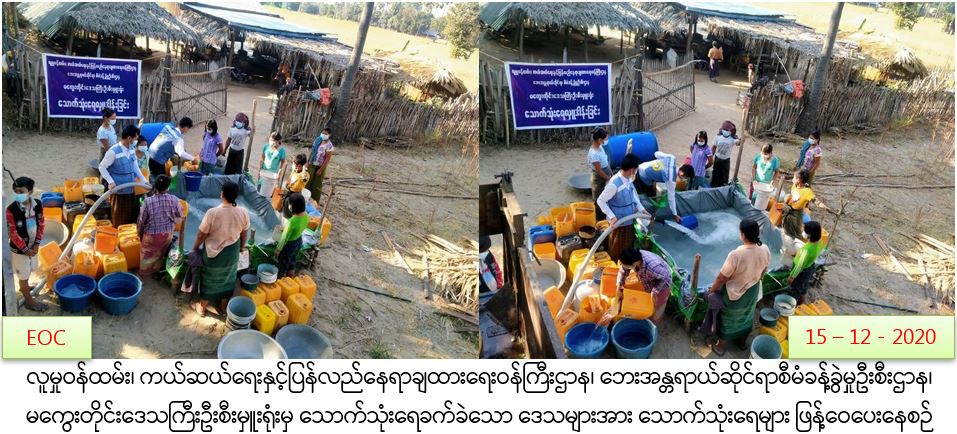 လူမှုဝန်ထမ်း၊ ကယ်ဆယ်ရေးနှင့်ပြန်လည်နေရာချထားရေး၀န်ကြီးဌာန၊ ဘေးအန္တရာယ်ဆိုင်ရာစီမံခန့်ခွဲမှုဦးစီးဌာန၊ မကွေးတိုင်းဒေသကြီးဦးစီးမှူးရုံးမှ တာဝန်ရှိသူများသည် သောက်သုံးရေခက်ခဲသော မကွေးမြို့နယ်၊ ကြာကန်ကျေးရွာအုပ်စု၊ ဦးဝင်းကြည်(တဲတိုက်)ရှိ အိမ်ခြေ (၁၀၇) လုံး၊ အိမ်ထောင်စု(၁၂၁) စု၊ လူဦးရေ (၅၃၉) ဦးတို့အတွက် သောက်သုံးရေဂါလံ (၆၀၀၀) အား ( ၁၅- ၁၂-၂၀၂၀) ရက်နေ့ ( ၁၁ : ၀၀ ) နာရီအချိန်တွင် သွားရောက်ဖြန့်ဝေပေးခဲ့ကြောင်း သတင်းရရှိပါသည်။