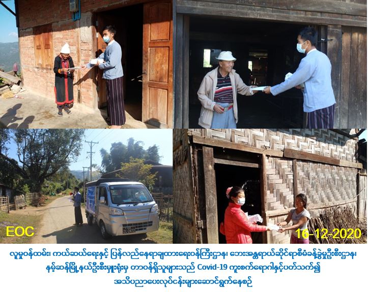 လူမှုဝန်ထမ်း၊ ကယ်ဆယ်ရေးနှင့် ပြန်လည်နေရာချထားရေးဝန်ကြီးဌာန၊ ဘေးအန္တရာယ် ဆိုင်ရာစီမံခန့်ခွဲမှုဦးစီးဌာန၊ နမ့်ဆန်မြို့နယ်ဦးစီးမှူးရုံးမှ တာဝန်ရှိသူများသည် (၁၆-၁၂-၂၀၂၀) ရက်နေ့တွင် လူမှုဝန်ထမ်းဦးစီးဌာန၊ ကျေးရွာအုပ်ချုပ်ရေးမှူးတို့နှင့် ပူးပေါင်း၍ ပလောင် ကိုယ်ပိုင်အုပ်ချုပ်ခွင့်ရဒေသ၊ နမ့်ဆန်မြို့နယ်၊ တောင်မကျေးရွာအုပ်စု၊ တောင်မကျေးရွာ၊ တောင်မဲကျေးရွာ၊ တပ်မင်းသားကျေးရွာနှင့် ပန်စရန်းကျေးရွာတို့တွင် Covid-19 ဒုတိယ လှိုင်းကာလအတွင်း ပြည်သူများ လိုက်နာရမည့်ကျန်းမာရေးအမူအကျင့်များ အသိပညာပေး ခြင်းနှင့် သဘာဝဘေးဆိုင်ရာအသိပညာပေးခြင်း၊ နှာခေါင်းစည်း (Masks) နှင့် အသိပညာပေး လက်ကမ်းစာစောင်များ ဖြန့်ပေးဝေခြင်းလုပ်ငန်းတို့အား ဆောင်ရွက်ခဲ့ကြောင်း သတင်းရရှိ ပါသည်။