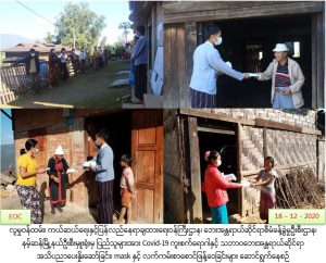 (၁၈.၁၂.၂၀၂၀)ရက်နေ့တွင် လူမှုဝန်ထမ်း၊ ကယ်ဆယ်ရေးနှင့်ပြန်လည်နေရာချထားရေးဝန်ကြီးဌာန၊ ဘေးအန္တရာယ်ဆိုင်ရာစီမံခန့်ခွဲမှုဦးစီးဌာန၊ နမ့်ဆန်မြို့နယ်ဦးစီးမှူးရုံးမှ တာဝန်ရှိသူများသည် လူမှုဝန်ထမ်းဦးစီးဌာန၊ ကျေးရွာအုပ်ချုပ်ရေးမှူးတို့နှင့် ပူးပေါင်း၍ ပလောင်ကိုယ်ပိုင်အုပ်ချုပ်ခွင့်ရဒေသ၊ နမ့်ဆန်မြို့နယ်၊ မန်ကန်ကျေးရွာအုပ်စု၊ မန်ကန်ကျေးရွာနှင့် ဟိုခြစ်ကျေးရွာတို့တွင် Covid-19 ဒုတိယလှိုင်းကာလအတွင်း ပြည်သူများ လိုက်နာရမည့်ကျန်းမာရေးအမူအကျင့်များ အသိပညာပေးခြင်းနှင့် သဘာဝဘေးဆိုင်ရာ အသိပညာပေးခြင်း၊ နှာခေါင်းစည်း (Masks) နှင့် အသိပညာပေးလက်ကမ်းစာစောင်များ ဖြန့်ပေးဝေခြင်းများ ဆောင်ရွက်ခဲ့ကြောင်း သတင်းရရှိပါသည်။