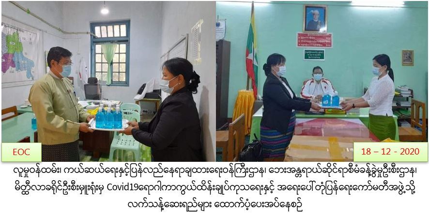 လူမှုဝန်ထမ်း၊ ကယ်ဆယ်ရေးနှင့်ပြန်လည်နေရာချထားရေးဝန်ကြီးဌာန၊ ဘေးအန္တရာယ်ဆိုင်ရာစီမံခန့်ခွဲမှုဦးစီးဌာန၊ မိတ္ထီလာခရိုင်ဦးစီးရုံးမှတာဝန်ရှိသူများသည် (၁၈-၁၂-၂၀၂၀)ရက်နေ့တွင် မိတ္ထီလာခရိုင်နှင့် မိတ္ထီလာမြို့နယ် Covid19ရောဂါကာကွယ်ထိန်းချုပ်ကုသရေးနှင့် အရေးပေါ်တုံပြန်ရေးကော်မတီအဖွဲ့သို့ ရောဂါကာကွယ်ထိန်းချုပ်ကုသရေးတွင်အသုံးပြုနိုင်ရန်အတွက် Sanitizer 500 ml လက်သန့်ဆေးရည် (၆၅)ဘူးကို ထောက်ပံ့ပေးအပ်ခဲ့ကြောင်း သတင်းရရှိပါသည်။