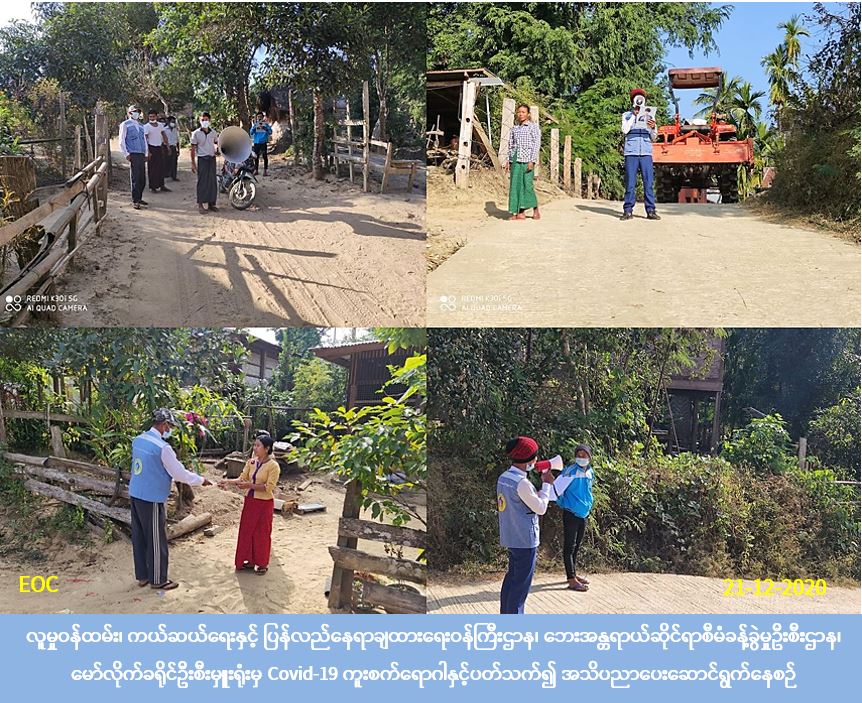 လူမှုဝန်ထမ်း၊ ကယ်ဆယ်ရေးနှင့် ပြန်လည်နေရာချထားရေးဝန်ကြီးဌာန၊ ဘေးအန္တရာယ်ဆိုင်ရာစီမံခန့်ခွဲမှုဦးစီးဌာန၊ မော်လိုက်ခရိုင်ဦးစီးမှူးရုံးမှ တာဝန်ရှိသူများသည် COVID-19 ကူးစက်ရောဂါ မဖြစ်ပေါ်စေရေးအတွက် အသိပညာပေးခြင်းလုပ်ငန်းအား (၂၁-၁၂-၂၀၂၀) ရက်နေ့တွင် ကောင်းကွေကျေးရွာ၊ မှန်နွဲကျေးရွာ၊ ကြုပ်သာကျေးရွာစသည့်ကျေးရွာတို့တွင် ကျေးရွာအုပ်ချုပ်ရေးမှူးတို့နှင့်အတူ အသိပညာပေးလှည့်လည်နှိုးဆော်ခဲ့ပြီး သဘာဝဘေးအသိပညာပေးလက်ကမ်းစာစောင်များ ဖြန့်ဝေခဲ့ပါကြောင်း သတင်းရရှိပါသည်။