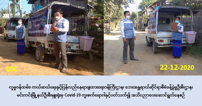 လူမှုဝန်ထမ်း၊ ကယ်ဆယ်ရေးနှင့် ပြန်လည်နေရာချထားရေးဝန်ကြီးဌာန၊ ဘေးအန္တရာယ်ဆိုင်ရာ စီမံခန့်ခွဲမှုဦးစီးဌာန၊ မင်းကင်းမြို့နယ်ဦးစီးမှူးရုံးမှ တာဝန်ရှိသူများသည် မင်းကင်းမြို့နယ်၊ ကျေးတောင်ဦးကျေးရွာ၊ ကံကျေးရွာ၊ တောင်ယာတောကျေးရွာ၊ ဆည်ချောင်းကျေးရွာနှင့် ပျဉ်းပင်မှော်ကျေးရွာတို့တွင် (၂၂-၁၂-၂၀၂၀) ရက်နေ့၌ Covid-19 ကူးစက်ရောဂါ ကြိုတင်ကာကွယ်ရေးအသိပညာပေးလုပ်ငန်းများ ဆောင်ရွက်ခဲ့ကြောင်း သတင်းရရှိပါသည်။