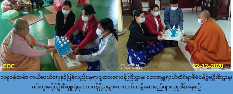 လူမှုဝန်ထမ်း၊ ကယ်ဆယ်ရေးနှင့်ပြန်လည်နေရာချထားရေးဝန်ကြီးဌာန၊ ဘေးအန္တရာယ်ဆိုင်ရာ စီမံခန့်ခွဲမှုဦးစီးဌာန၊ မင်းဘူးခရိုင်ဦးစီးမှူးရုံးမှ တာဝန်ရှိသူများသည် မင်းဘူးမြို့၊ အောက်ကျောင်း ဘုန်းတော်ကြီးကျောင်းနှင့် သုခကာရီသီလရှင်စာသင်တိုက်များသို့ Hand Sanitizer (500 ml) ပါ ဘူး (၁၀၀) အား (၂၂-၁၂-၂၀၂၀) ရက်နေ့တွင် သွားရောက်လှူဒါန်းခဲ့ပါကြောင်း သတင်းရရှိပါ သည်။