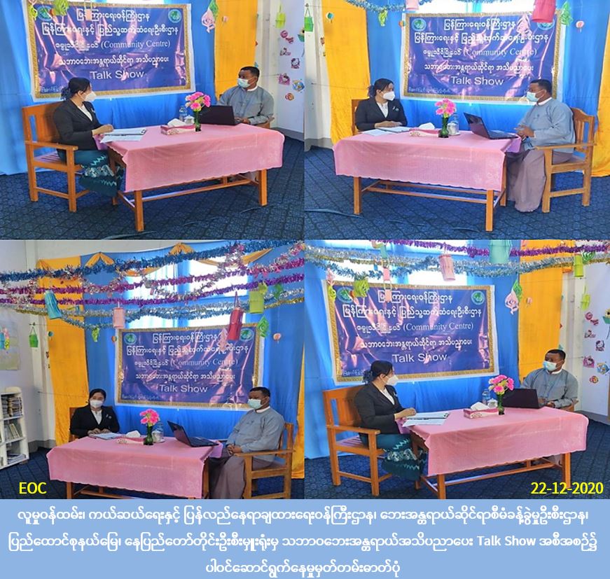 လူမှုဝန်ထမ်း၊ ကယ်ဆယ်ရေးနှင့် ပြန်လည်နေရာချထားရေးဝန်ကြီးဌာန၊ ဘေးအန္တရာယ်ဆိုင်ရာစီမံခန့်ခွဲမှုဦးစီးဌာန၊ ပြည်ထောင်စုနယ်မြေနေပြည်တော်တိုင်းဦးစီးမှူးရုံးမှ တာဝန်ရှိသူသည် (၂၂-၁၂-၂၀၂၀) ရက်နေ့တွင် ဇမ္ဗူသီရိမြို့နယ်၊ ပြန်ကြားရေးနှင့်ပြည်သူ့ဆက်ဆံရေးစီးဌာန၏ဖိတ်ကြားချက်အရ သဘာဝဘေးအန္တရာယ် အသိပညာပေး Talk Show အစီစဉ်တွင်ပါဝင်ခဲ့ပါကြောင်း သတင်းရရှိပါသည်။