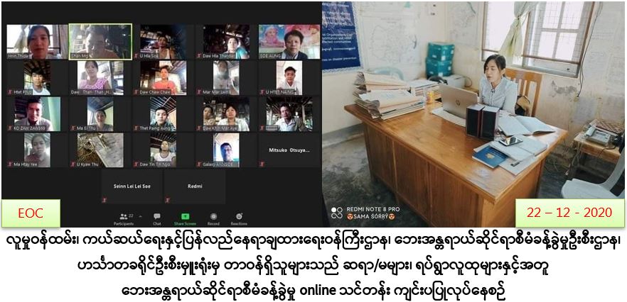 လူမှုဝန်ထမ်း၊ ကယ်ဆယ်ရေးနှင့်ပြန်လည်နေရာချထားရေးဝန်ကြီးဌာန၊ ဘေးအန္တရာယ်ဆိုင်ရာစီမံခန့်ခွဲမှုဦးစီးဌာန၊ ဟင်္သာတခရိုင်ဦးစီးမှူးရုံးမှ တာဝန်ရှိသူများသည် မြန်မာနိုင်ငံအင်ဂျင်နီယာအသင်းချုပ်၊ SEED Asia နှင့်ပူးပေါင်း၍ ဟင်္သာတခရိုင်၊ ဟင်္သာတမြို့နယ်၊ ခြင်ဘို့အုပ်စု၊ ဝါးဘို့ခြင်ဘို့ကျေးရွာရှိ ဆရာ/မများ၊ ရပ်ရွာသဘာဝဘေးစီမံခန့်ခွဲမှုကော်မတီဝင်များနှင့်ရပ်ရွာလူထုများအား ဘေးအန္တရာယ်ဆိုင်ရာစီမံခန့်ခွဲမှုသင်တန်းကို (၂၂-၁၂-၂၀၂၀) ရက်နေ့(၀၉း၃၀)နာရီအချိန်မှ(၁၆း၃၀)နာရီအချိန်ထိ Online သင်တန်း ကျင်းပပြုလုပ်ခဲ့ရာ အဆိုပါ သင်တန်းအားတက်ရောက်လူဦးရေ(၃၃)ဦးဖြင့် Covid-19ကာလ ကျန်းမာရေးနှင့်အားကစားဝန်ကြီးဌာနက ထုတ်ပြန်ထားသော စည်းကမ်းချက်များနှင့်အညီ ကျင်းပပြုလုပ်ဆောင်ရွက်ခဲ့ကြောင်း သတင်းရရှိပါသည်။