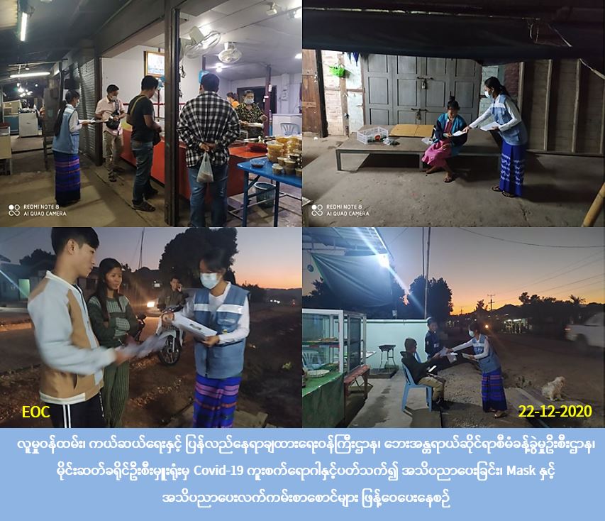 လူမှုဝန်ထမ်း၊ ကယ်ဆယ်ရေးနှင့် ပြန်လည်နေရာချထားရေးဝန်ကြီးဌာန၊ ဘေးအန္တရာယ်ဆိုင်ရာစီမံခန့်ခွဲမှုဦးစီးဌာန၊ မိုင်းဆတ်ခရိုင်ဦးစီးမှူးရုံးမှ တာဝန်ရှိသူများသည် (၂၂-၁၂-၂၀၂၀) ရက်နေ့ညတွင် မိုင်းဆတ်မြို့နယ်၊ မယ်ဆွမ်(တောင်) ရပ်ကွက်၊ မယ်ဆွမ်(မြောက်)ရပ်ကွက်၊ ဝမ်ကျောင်းရပ်ကွက်၊ နောင်ဟီးရပ်ကွက်၊ မြို့သစ်ရပ်ကွက်၊ ဝိန်းနေရပ်ကွက်၊ ဝိန်းဝိုင်ရပ်ကွက်၊ ကျဒယ်ရပ်ကွက်၊ နားကောရပ်ကွက်၊ နားမရပ်ကွက်နှင့် နောင်ပိုရွာတို့၌ Covid-19 ကာလအတွင်း ပြည်သူများ လိုက်နာရမည့် ကျန်းမာရေး အမူအကျင့်များ အသိပညာပေးခြင်းနှင့် သဘာဘေးဆိုင်ရာအသိပညာပေးခြင်းများကို အသံချဲ့စက်များဖြင့် လှည့်လည်ဟောပြောခြင်း၊ Masks နှင့် အသိပညာပေး လက်ကမ်းစာစောင်များ ဖြန့်ဝေပေးခြင်းတို့အား ဆောင်ရွက်ခဲ့ပါကြောင်း သတင်းရရှိပါသည်။