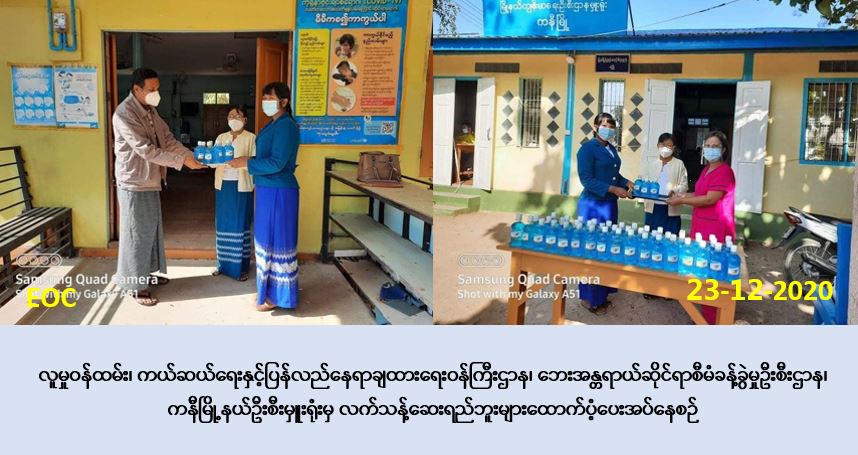လူမှုဝန်ထမ်း၊ ကယ်ဆယ်ရေးနှင့် ပြန်လည်နေရာချထားရေးဝန်ကြီးဌာန၊ ဘေးအန္တရာယ်ဆိုင်ရာ စီမံခန့်ခွဲမှုဦးစီးဌာန၊ ကနီမြို့နယ်ဦးစီးမှူးရုံးမှ တာဝန်ရှိသူများသည် (၂၃-၁၂-၂၀၂၀) ရက်နေ့တွင် ကနီမြို့နယ်အတွင်း Covid – 19 ရောဂါ ကာကွယ်၊ ထိန်းချုပ်၊ ကုသရေးလုပ်ငန်းများ ဆောင်ရွက်ရာတွင် အသုံးပြုနိုင်ရန်အတွက် ကနီမြို့နယ် ပြည်သူ့ဆေးရုံကြီးသို့ Hand Sanitizer (၅၀) ဘူးနှင့် ဟိတပုညလူမှုကူညီရေးအသင်းသို့ Hand Sanitizer (၁၀) ဘူးတို့အား ထောက်ပံ့ပေးအပ်ခဲ့ကြောင်း သတင်းရရှိပါသည်။