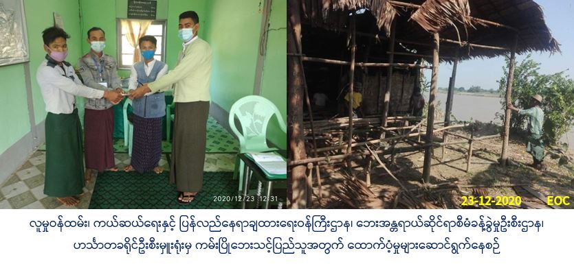 လူမှုဝန်ထမ်း၊ ကယ်ဆယ်ရေးနှင့် ပြန်လည်နေရာချထားရေးဝန်ကြီးဌာန၊ ဘေးအန္တရာယ်ဆိုင်ရာစီမံခန့်ခွဲမှုဦးစီးဌာန၊ ဟင်္သာတခရိုင်ဦးစီးမှူးရုံးမှ တာဝန်ရှိသူများသည် (၂၁-၁၂-၂၀၂၀) ရက်နေ့၌ ဟင်္သာတခရိုင်၊ လေးမျက်နှာမြို့နယ်၊ ယင်းဆယ် အုပ်စု၊ ယင်းဆယ်ကျေးရွာတွင် ဖြစ်ပွားခဲ့သော ကမ်းပြိုဘေးကြောင့် ကြိုတင်ရွှေ့ပြောင်းခဲ့ရသော အိမ်ခြေ(၁)လုံးအတွက် အိမ်ဆောက်ပစ္စည်းဖိုးထောက်ပံ့ငွေ (၁၀၀၀၀၀/-)ကျပ်၊ လူဦးရေ(၆)ဦးအတွက် ဆန်ရိက္ခာ(၇)ရက်စာဖိုးထောက်ပံ့ငွေ (၁၂၆၀၀/-) ကျပ်တို့ကို (၂၃-၁၂-၂၀၂၀) ရက်နေ့၊ (၁၂:၃၀) နာရီအချိန်တွင် လေးမျက်နှာမြို့နယ်၊ အထွေထွေအုပ်ချုပ်ရေးဦးစီးဌာန၌ သက်ဆိုင်ရာတာဝန်ရှိသူများနှင့်အတူ ဘေးသင့်ပြည်သူများလက်ဝယ်သို့အရောက် ထောက်ပံ့ပေးအပ်ခဲ့ပါကြောင်း သတင်းရရှိပါ သည်။