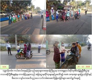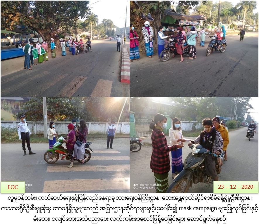 လူမှုဝန်ထမ်း၊ ကယ်ဆယ်ရေးနှင့်ပြန်လည်နေရာချထာရေးဝန်ကြီးဌာန၊ ဘေးအန္တရာယ်ဆိုင်ရာစီမံခန့်ခွဲမှုဦးစီးဌာန၊ ကသာခရိုင်ဦးစီးမှူးရုံးမှ (၂၃.၁၂.၂၀၂၀)နေ့(၀၇း၃၀)နာရီမှ(၀၉း၀၀)နာရီအချိန်ထိ ကသာမြို့၊ အထက(၁) ကျောင်းရှေ့၌ အခြားဌာနဆိုင်ရာတာဝန်ရှိသူများနှင့်အတူ mask campaign ပြုလုပ်ခြင်းနှင့် မီးဘေး၊ ငလျင်ဘေးလက်ကမ်းစာစောင်များ ဖြန့်ဝေခဲ့ကြောင်း သတင်းရရှိပါသည်။
