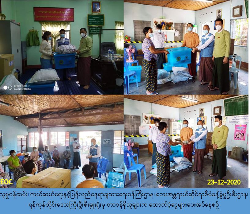 လူမှုဝန်ထမ်း၊ ကယ်ဆယ်ရေးနှင့်ပြန်လည်နေရာချထားရေးဝန်ကြီးဌာန၊ ဘေးအန္တရာယ်ဆိုင်ရာ စီမံခန့်ခွဲမဦးစီးဌာန၊ ရန်ကုန်တိုင်းဒေသကြီးဦးစီးမှူးရုံး မှတာဝန်ရှိသူများသည် ရန်ကုန်တိုင်း ဒေသကြီး၊ သန်လျင်မြို့နယ်၊ အမှုထမ်းရပ်ကွက်၊ ရွှေဝါလမ်းသွယ် (၂) လမ်းတွင် (၂၀-၁၂-၂၀၂၀) ရက်နေ့ (၁၃:၃၇) နာရီအချိန်၌ မီးလောင်မှုဖြစ်ပွားခဲ့ရာ နေအိမ် (၂) လုံးမီးလောင်ဆုံးရှုံးခဲ့ပြီး၊ အိမ်ထောင်စု (၄) စုမှ လူဦးရေ (၁၁) ဦးတို့ မီးဘေးသင့်ခဲ့ရာ နေအိမ် (၂) လုံးအတွက် အိမ် ဆောက်ပစ္စည်းဖိုးထောက်ပံ့ငွေ (၄၀၀,၀၀၀/-) ကျပ်၊ လူဦးရေ (၁၁) ဦးအတွက် ဆန်ရိက္ခာဖိုး ထောက်ပံ့ငွေ (၂၃,၁၀၀/-) ကျပ် နှင့် ကယ်ဆယ်ရေးပစ္စည်း (၁၆) မျိုး (၄) အိမ်ထောင်စုစာ တို့အားလည်းကောင်း၊ ဒလမြို့နယ်၊ ဗိုလ်ရန်ပြေရပ်ကွက်၊ မင်းရဲကျော်စွာ (၁) လမ်းတွင် (၂၂-၁၂-၂၀၂၀) ရက်နေ့ (၁၄:၄၀) နာရီအချိန်၌ မီးလောင်မှုဖြစ်ပွားခဲ့ပါသဖြင့် နေအိမ် (၃) လုံးမီးလောင် ဆုံးရှုံးခဲ့ပြီး နေအိမ် (၁) လုံးမီးတားကြိုတင်ဖျက်သိမ်းခဲ့ရာ အိမ်ထောင်စု (၅) စုမှ လူဦးရေ (၁၈) ဦးတို့ မီးဘေးသင့်ခဲ့ပါသဖြင့် ရန်ကုန်တိုင်းဒေသကြီးဦးစီးမှူးရုံးမှ အိမ်ဆောက်ပစ္စည်းဖိုး ထောက်ပံ့ငွေ (၇၀၀,၀၀၀/-) ကျပ်၊ လူဦးရေ (၁၈) ဦးအတွက် ဆန်ရိက္ခာဖိုးထောက်ပံ့ငွေ (၃၇,၈၀၀/-) ကျပ်နှင့် ကယ်ဆယ်ရေးပစ္စည်း (၁၆) မျိုး (၅) အိမ်ထောင်စုစာတို့အားလည်း ကောင်း အထွေထွေအုပ်ချုပ်ရေး ဦးစီးဌာနမှ တာဝန်ရှိသူများနှင့်အတူ ဘေးသင့်ပြည်သူများထံ သို့ (၂၃-၁၂-၂၀၂၀) ရက်နေ့ (၁၃:၃၀) နာရီအချိန်၌ သွားရောက်ထောက်ပံ့ပေးအပ်ခဲ့ပါကြောင်း သတင်း ရရှိပါသည်။