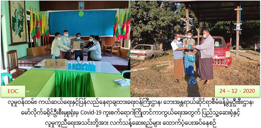 လူမှုဝန်ထမ်း၊ ကယ်ဆယ်ရေးနှင့်ပြန်လည်နေရာချထားရေးဝန်ကြီးဌာန၊ ဘေးအန္တရာယ်ဆိုင်ရာစီမံခန့်ခွဲမှုဦးစီးဌာန၊ မော်လိုက်ခရိုင်ဦးစီးမှူးရုံးမှတာဝန်ရှိသူများသည် (၂၄.၁၂.၂၀၂၀)ရက်နေ့ (၁၀)နာရီအချိန်တွင် မြို့နယ်အုပ်ချုပ်ရေးမှူးနှင့်အတူ ရေသန့်ဆေးရည်(၂၄၀)ထုပ်ပါ (၈)ဖာနှင့် လက်သန့်ဆေးရည် (၁၀၀)ဘူးတို့အား (COVID.19 )ထိန်းချုပ်ရေးနှင့် အရေးပေါ်တုံ့ပြန်ရေးကော်မတီသို့ အထွေထွေအုပ်ချုပ်ရေးဦးစီးဌာနအစည်းအဝေးခန်းမတွင် လှူဒါန်းခဲ့ပြီး မော်လိုက်ခရိုင်ပြည်သူ့ဆေးရုံအတွက် လက်သန့်ဆေးရည်(၂၀)ဘူး၊ ဆုပန်ရွေပြည်လူမှုကူညီရေးအသင်းအတွက် လက်သန့်ဆေးရည် (၁၅)ဘူး တို့အား သွားရောက်လှူဒါန်းခဲ့ကြောင်း သတင်းရရှိပါသည်။