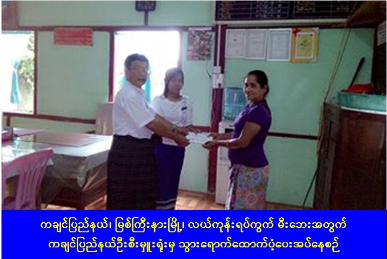 (၂၉.၈.၂၀၁၆) ရက်နေ့၌ ကချင်ပြည်နယ်၊ မြစ်ကြီးနားမြို့၊ လယ်ကုန်းရပ်ကွက်တွင် နေအိမ်တစ်အိမ် မီးလောင်ကျွမ်းခဲ့ပြီး ၄င်းမီးဘေးသင့်နေအိမ်အတွက် အိမ်ဆောက်ပစ္စည်းဖိုးငွေ (၅၀၀၀၀/-)ကျပ်၊ မီးဘေးသင့်သူ (၄)ဦးအတွက် ဆန်ရိက္ခာဖိုး (၃)ရက်စာ ငွေ(၃၆၀၀/-)ကျပ်နှင့် ကယ်ဆယ်ရေးပစ္စည်း (၉)မျိုးတို့ကို (၁.၉.၂၀၁၆) ရက်နေ့တွင် ကချင်ပြည်နယ်ဦးစီးမှူးရုံးမှ သွားရောက်ထောက်ပံ့ခဲ့ကြောင်း သတင်းရရှိပါသည်။