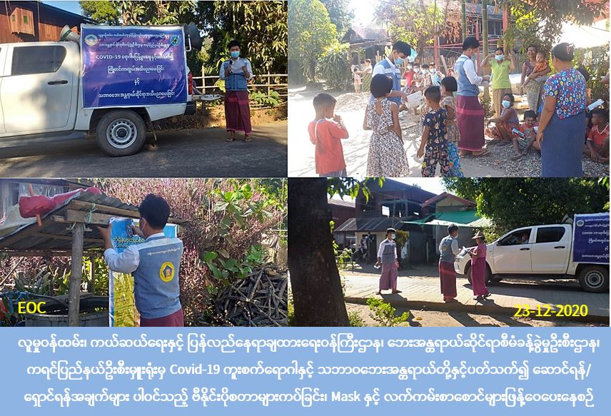 လူမှုဝန်ထမ်း၊ ကယ်ဆယ်ရေးနှင့် ပြန်လည်နေရာချထားရေးဝန်ကြီးဌာန၊ ဘေးအန္တရာယ်ဆိုင်ရာစီမံခန့်ခွဲမှုဦးစီးဌာန၊ ကရင်ပြည်နယ်ဦးစီးမှူးရုံးမှ တာဝန်ရှိသူများသည် (၂၃-၁၂-၂၀၂၀) ရက်နေ့၊ နံနက်(၁၁:၀၀)နာရီချိန်မှ နေ့လည်(၁၆:၀၀)နာရီချိန်ထိ ဘားအံမြို့နယ်၊ တရုတ်လှစံပြကျေးရွာ၊ ဖားကပ်စံပြကျေးရွာ၊ ကော့လှိုက်ကျေးရွာ၊ ကော့ကျိုက်ကျေးရွာ၊ ဒုံရင်းကျေးရွာ၊ ရဲသာရွာသစ်ကျေးရွာ၊ ကမော့ကစင်ကျေးရွာများရှိ ပြည်သူများအား COVID-19 ကူးစက်မြန်ရောဂါ ပြန့်ပွားမှုများမဖြစ်ပွားစေရန်အတွက် သိရှိလိုက်နာရမည့် အချက်များနှင့် မိုးရာသီကာလအတွင်းဖြစ်ပွားတက်သော သဘာဝဘေးအန္တရာယ်များဖြစ်သည့် လေပြင်းဘေးများနှင့် စပ်လျဉ်း၍ ဆောင်ရန်/ရှောင်ရန်အချက်များအား လော်စပီကာဖြင့် အသိပညာပေးဆောင်ရွက်ခဲ့ပြီး လက်ကမ်းစာစောင်များလည်း ဖြန့်ဝေပေးခြင်း၊ ဗီနိုင်းပိုစတာများ သိသာထင်ရှားသည့်နေရာများ၌ ကပ်ခြင်းနှင့် Mask များလည်းဖြန့်ဝေပေးခဲ့ပါကြောင်း သတင်းရရှိပါသည်။