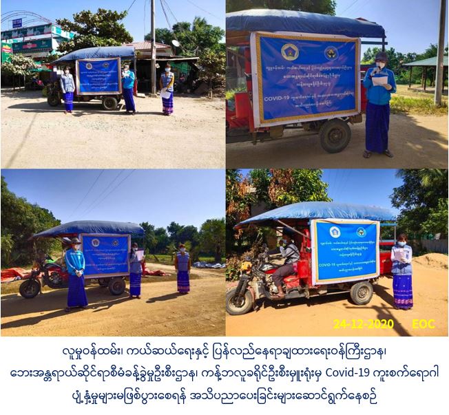 လူမှုဝန်ထမ်း၊ ကယ်ဆယ်ရေးနှင့် ပြန်လည်နေရာချထားရေးဝန်ကြီးဌာန၊ ဘေးအန္တရာယ်ဆိုင်ရာစီမံခန့်ခွဲမှုဦးစီးဌာန၊ ကန့်ဘလူခရိုင်ဦးစီးမှူးရုံးမှ တာဝန်ရှိသူများသည် (၂၄-၁၂-၂၀၂၀)ရက်နေ့ (၀၉:၀၀)နာရီအချိန်မှ (၁၂:၀၀)နာရီအချိန်ထိ ကျွန်းလှမြို့နယ်၊ ရှမ်းစုကျေးရွာအုပ်စု၊ ရှမ်းစုကျေးရွာ၊ တပ်ကုန်းကျေးရွာ၊ အင်းကောင်းကျေးရွာအုပ်စု၊ အင်းကောင်းကျေးရွာ၊ တင်းတိန်ရံကျေးရွာနှင့် ကျောင်းအင်းကျေးရွာများသို့သွားရောက်ပြီး မိဘပြည်သူများအား COVID-19ရောဂါနှင့်ပတ်သက်၍ ရောဂါကူးစက်မှုပျံ့နှံ့မှု ဆက်လက်မဖြစ် ပွားစေရေး ဆောင်ရန်/ရှောင်ရန်များကို အသိပညာပေးနှိုးဆော်ခြင်းတို့ ဆောင်ရွက် ခဲ့ပါကြောင်း သတင်းရရှိပါသည်။