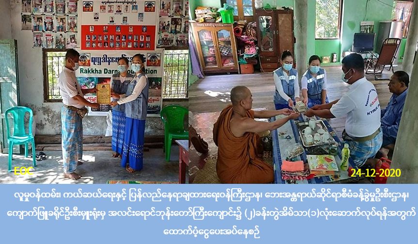 လူမှုဝန်ထမ်း၊ ကယ်ဆယ်ရေးနှင့် ပြန်လည်နေရာချထားရေးဝန်ကြီးဌာန၊ ဘေးအန္တရာယ်ဆိုင်ရာစီမံခန့်ခွဲမှုဦးစီးဌာန၊ ကျောက်ဖြူခရိုင်ဦးစီးမှူးရုံးမှ တာဝန်ရှိသူများသည် ကျောက်ဖြူမြို့၊ ကညင်တောရပ်ကွက်၊ အလင်းရောင်ဘုန်းတော်ကြီးကျောင်း၌ (၂)ခန်းတွဲအိမ်သာ(၁)လုံးတည်ဆောက်ရန် ထောက်ပံ့ငွေ(၁,၈၀၀,၀၀၀)အား (၂၄-၁၂-၂၀၂၀) ရက်နေ့ နံနက်(၁၁:၂၀)အချိန်တွင် အလင်းရောင်ဘုန်းတော်ကြီးကျောင်း၊ ကျောင်းထိုင်ဆရာတော်နှင့် ရက္ခဒါနဖောင်ဒေးရှင်းအရေးပေါ်ကယ်ဆယ်ရေးအဖွဲ့ဥက္ကဌထံသို့ သွားရောက်ထောက်ပံ့ပေးအပ်ခဲ့ပါကြောင်း သတင်းရရှိပါသည်။