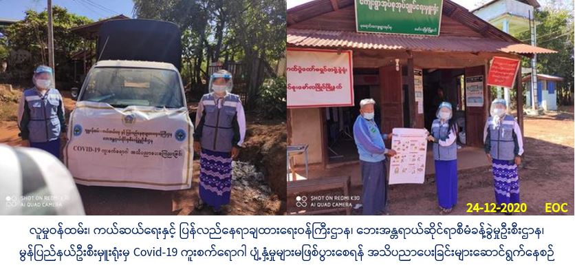 လူမှုဝန်ထမ်း၊ ကယ်ဆယ်ရေးနှင့် ပြန်လည်နေရာချထားရေးဝန်ကြီးဌာန၊ ဘေးအန္တရာယ်ဆိုင်ရာစီမံခန့်ခွဲမှုဦးစီးဌာန၊ မွန်ပြည်နယ်ဦးစီးမှူးရုံးမှ တာဝန်ရှိသူများသည် (၂၄-၁၂-၂၀၂၀)ရက်နေ့ (၁၀:၀၀)နာရီအချိန်မှ (၁၃:၀၀)နာရီအချိန်ထိ မော်လမြိုင် မြို့နယ်၊ မုရောင်းကျေးရွာတို့တွင် မိဘပြည်သူများအား COVID-19 ကူးစက်ရောဂါ ပျံ့နှံ့မှုများမဖြစ်ပွားစေရန် ဆောင်ရန်/ ရှောင်ရန်များကို အသိပညာပေးနှိုးဆော်ခြင်းနှင့် လက်ကမ်းစာစောင်များဖြန့်ဝေခြင်းတို့ ဆောင်ရွက်ခဲ့ပါကြောင်း သတင်းရရှိပါ သည်။