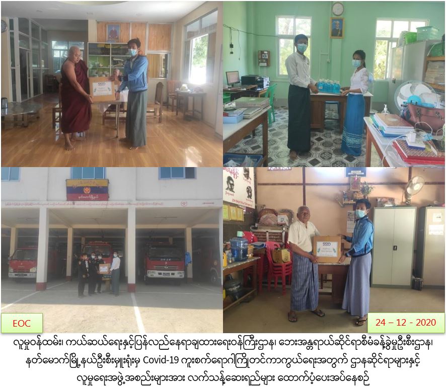 လူမှုဝန်ထမ်း၊ ကယ်ဆယ်ရေးနှင့်ပြန်လည်နေရာချထားရေးဝန်ကြီးဌာန၊ ဘေးအန္တရာယ်ဆိုင်ရာစီမံခန့်ခွဲမှုဦးစီးဌာန၊ နတ်မောက်မြို့နယ်ဦးစီးမှူးရုံးမှ တာဝန်ရှိသူများသည် (၂၄-၁၂-၂၀၂၀) ရက်နေ့တွင် နတ်မောက်မြို့နယ် (Covid-19) ကြိုတင်ကာကွယ် ရေးလုပ်ငန်းစဥ်များတွင်ပူးပေါင်းဆောင်ရွက်နေသော ဌာနဆိုင်ရာများနှင့် လူမှုရေးအဖွဲ့အစည်းများဖြစ်သည့် မီးသတ်ဦးစီးဌာန၊ မြို့နယ်စည်ပင်သာယာရေးအဖွဲ့၊ လူမှုဝန်ထမ်းဦးစီးဌာန၊ ဒီပင်္ကရာစာသင်တိုက်နှင့် စိတ်ဓာတ်ဖြူစင်လူမှုကူညီရေးအသင်း သို့ (500 ml)ပါလက်သန့်ဆေးရည်ဘူးစုစုပေါင်း (၂၀၀) ဘူးတို့အား သွားရောက်လှူဒါန်းခဲ့ကြောင်း သတင်းရရှိပါသည်။